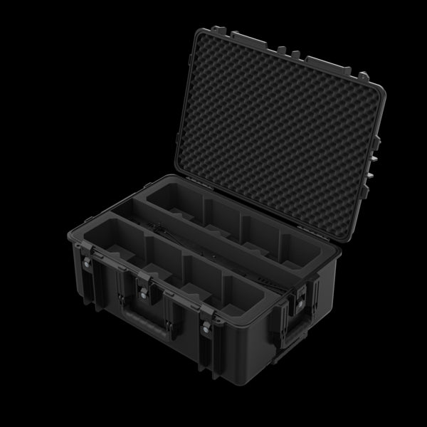 La mallette de transport de style pélican charge jusqu'à 8 luminaires Freedom Par simultanément. Le matériau en polypropylène haute résistance est résistant à l'eau et aux dommages
