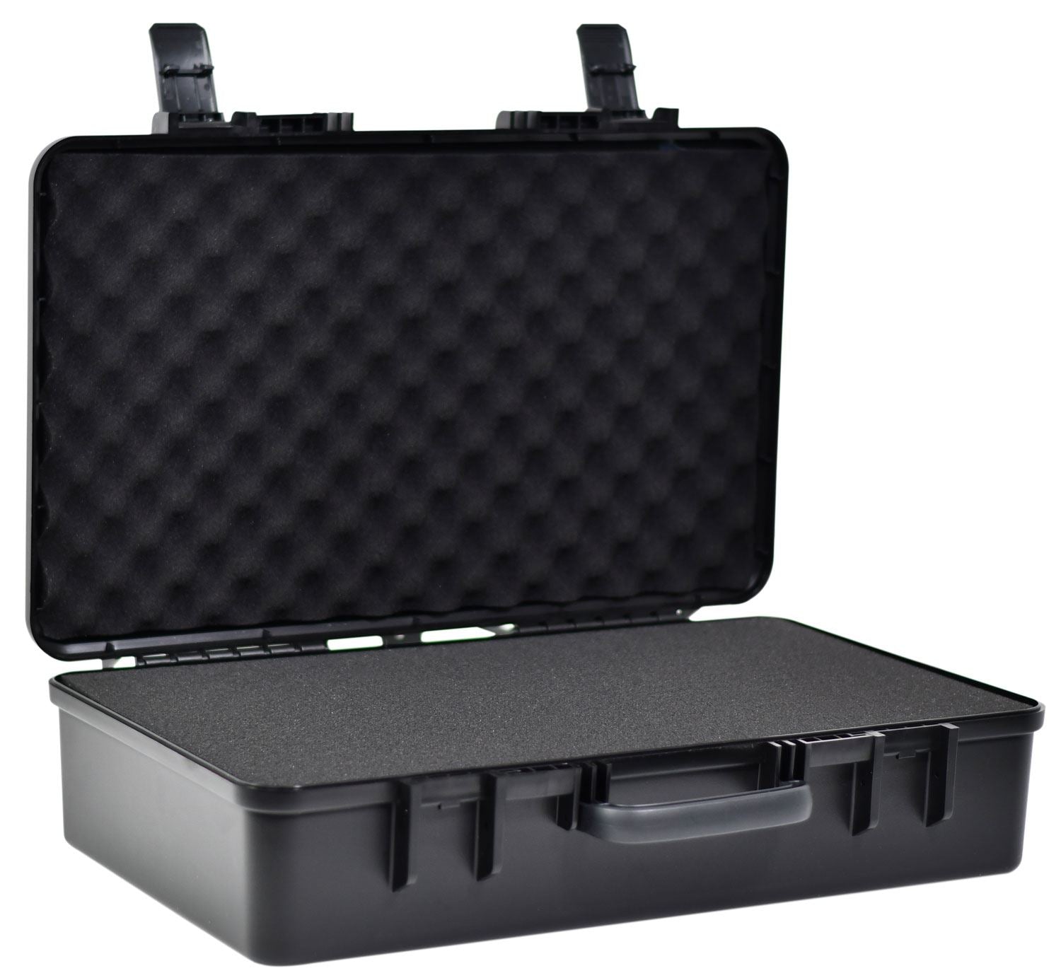Un boîtier moulé compact et robuste fabriqué à partir d'un matériau ABS haute densité et rempli de mousse plumeuse pour permettre la formation de découpes pour l'équipement stocké ou transporté. Résistant aux chocs et à l'eau pour protéger les équipements précieux. Équipé de 2 loquets à charnière pour une fermeture sécurisée et d'une poignée de transport pour la portabilité.