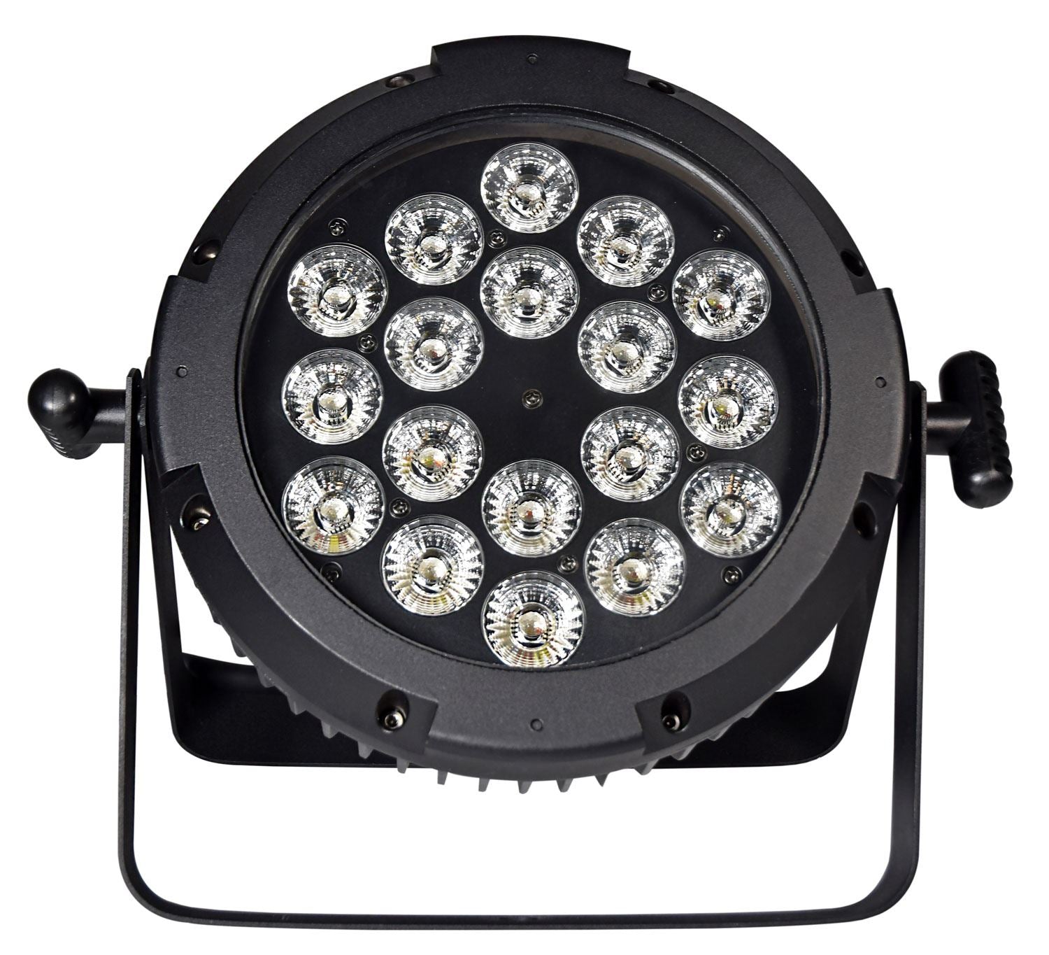 High power slim LED PAR can fitted with 18pcs of 10W super bright 6-in-1 COB LEDs built into an IP65 weatherproof housing for outdoor or indoor applications. Can be operated standalone from the internal auto programs or via DMX512 controller is more precise control is required. Pre-wired with waterproof power and DMX signal leads for easy connection and daisy-chaining. Supplied with split bracket which can also be used as a floor stand. Ideal solution for parties and events where background colour wash or U/V illumination is required.