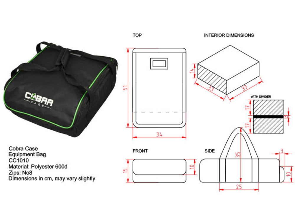 The COBRA CC1010 is a strong and versatile padded bag designed to protect a wide range of equipment—from lighting fixtures and camera gear to power tools. Crafted with robust nylon exterior and 10 mm internal foam padding, it safeguards against impacts, scratches, and dust. The bag includes a durable padded carry handle, a removable Velcro divider for customizable storage, a double-zip main opening for easy access, and an external zip pocket for accessories. An address label pocket adds convenience for organised transport and storage.
