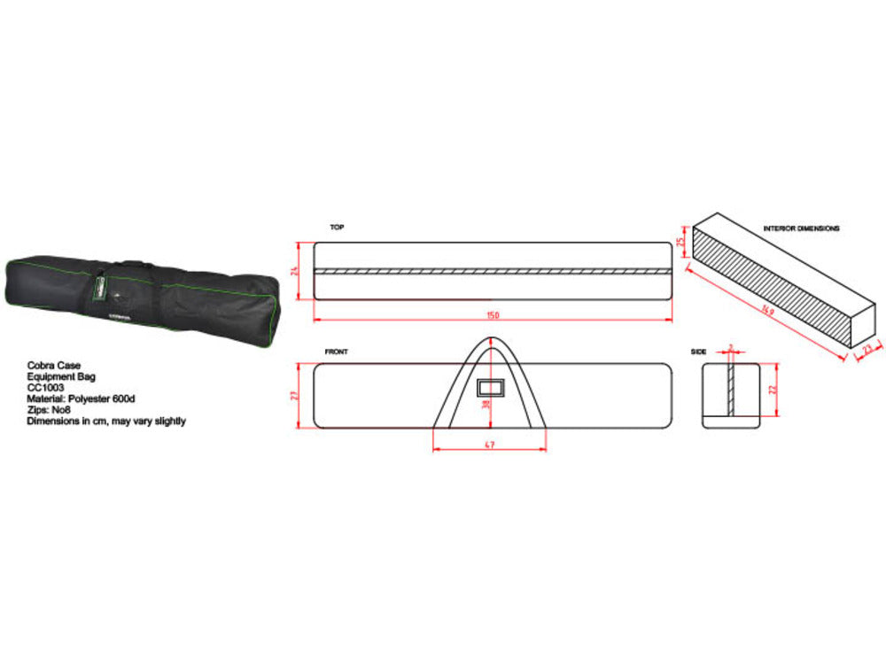 The COBRA CC1003 is a rugged stand bag crafted for secure transport and storage of lighting or loudspeaker stands, as well as drum hardware and similar equipment. Made from splash‑proof nylon, it resists moisture and daily wear. A double‑zip main opening and sturdy carry handle ensure effortless loading and transport between gigs or venues.