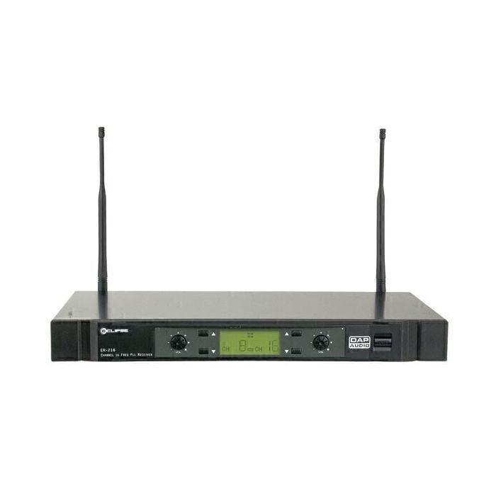 Le DAP ER-216 est un double récepteur sans fil UHF 19"/1U avec 16 canaux sélectionnables. Il dispose d'une fonctionnalité de sourdine du bruit et d'un circuit de silencieux à tonalité pilote pour éliminer les signaux indésirables et les interférences sonores. L'ER-216 est spécialement conçu pour l'EM- 16 microphones et un pack ceinture EB-16. Un support rack 19"/1U est inclus.