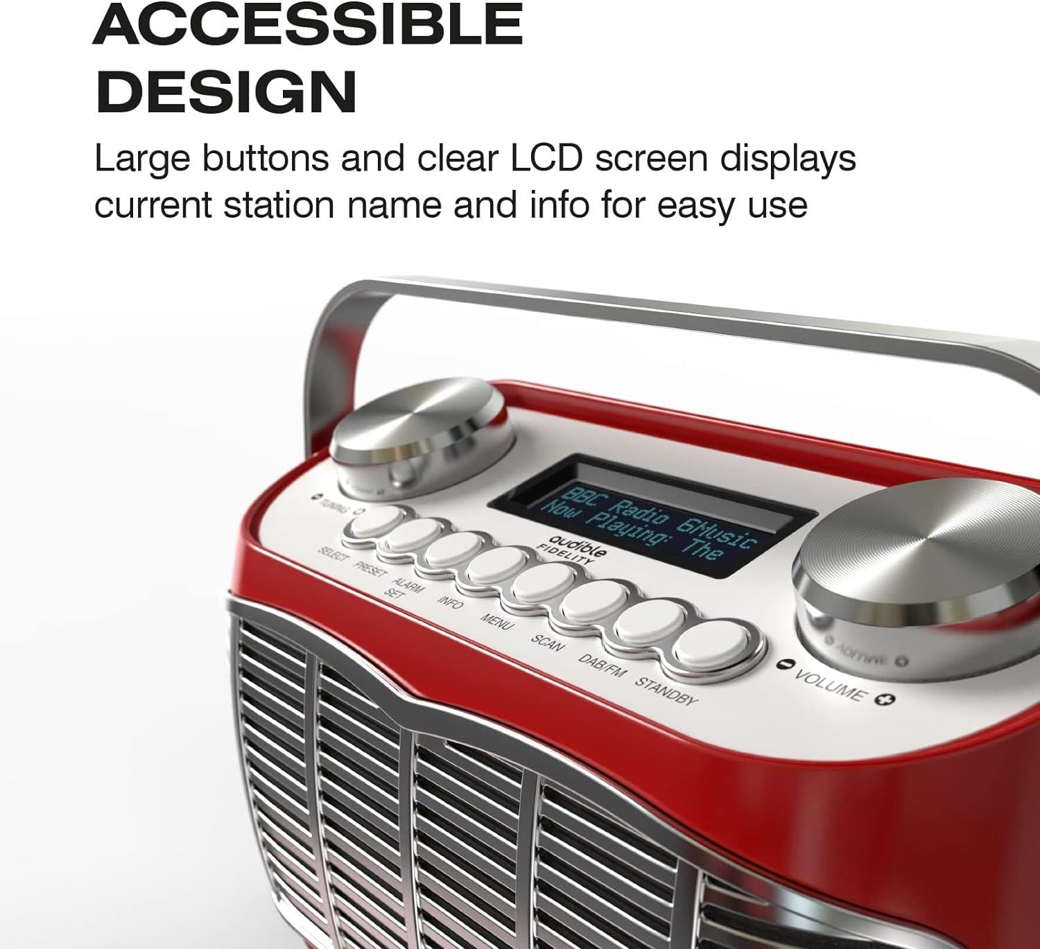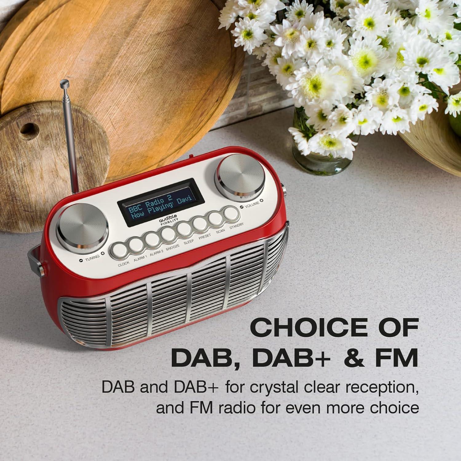 CLASSIC STYLING: The Detroit DAB Radio from Audible Fidelity combines timeless motor-city vintage design with the very latest in DAB/DAB+/FM digital radio technology performance, for a great addition to kitchen sides or bedroom tables. The accessible design houses large buttons and a clear, easy to read LCD display with station info.