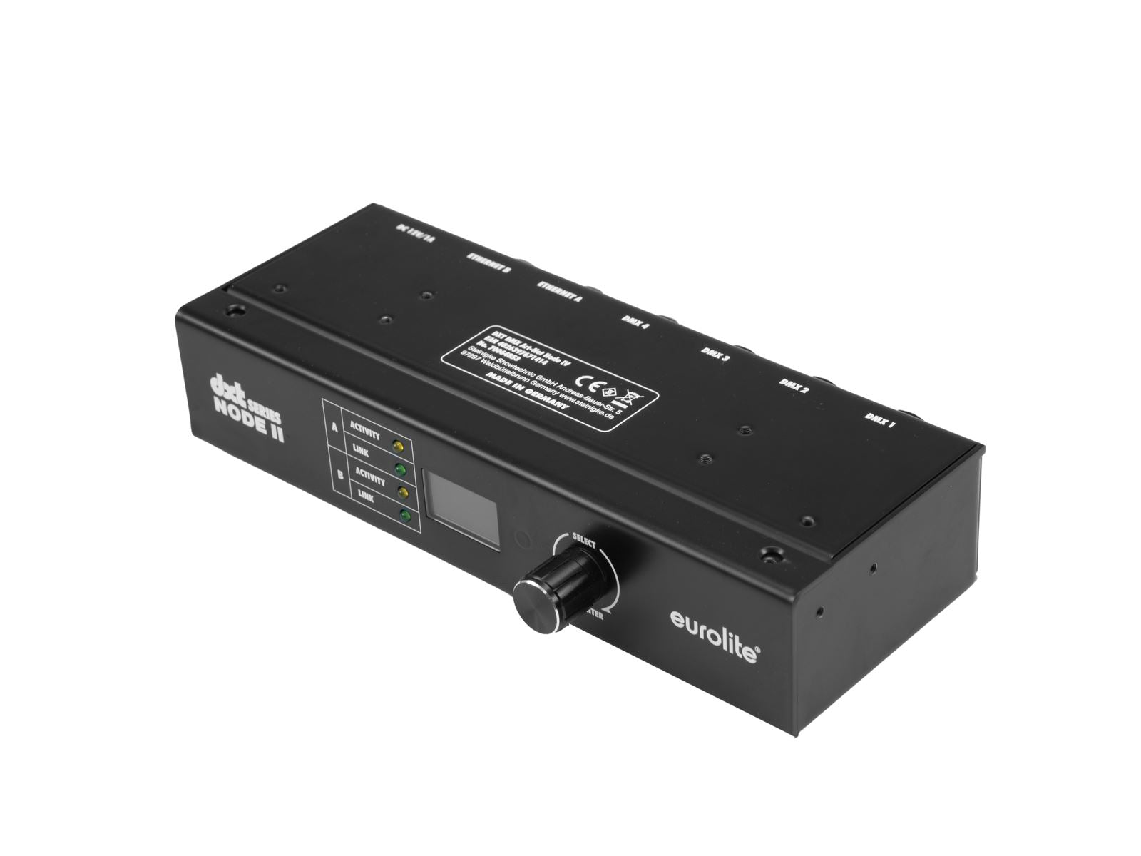 Le DXT DMX Pixel Art-Net Node II fait partie de la série DXT d'Eurolite, qui se compose d'outils DMX performants et fiables fabriqués en Allemagne. Le Node II dispose de deux canaux pouvant produire jusqu'à 512 canaux DMX chacun ou contrôler jusqu'à 512 canaux de pixels LED numériques. Il fournit deux connecteurs Neutrik XLR et 2 etherCON, ainsi que deux bornes amovibles à 4 broches. Le deuxième connecteur etherCON permet la connexion en série de la connexion réseau avec plusieurs appareils. L'appareil peut être configuré avec un écran OLED intégré, via Art-Net ou avec un site Web.