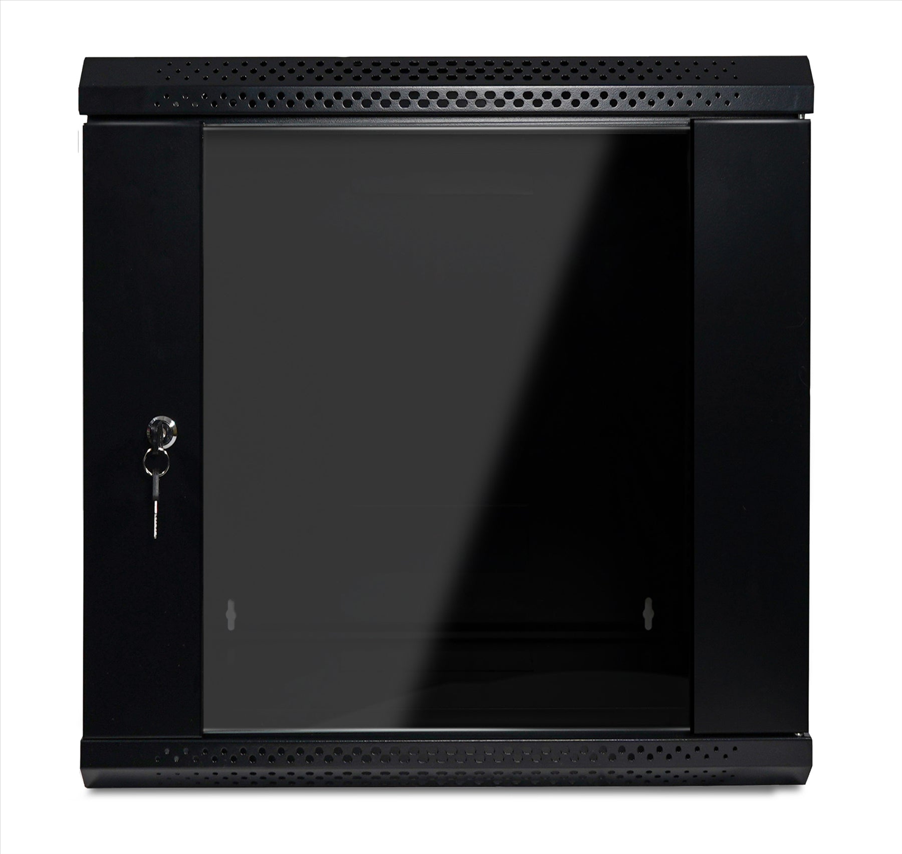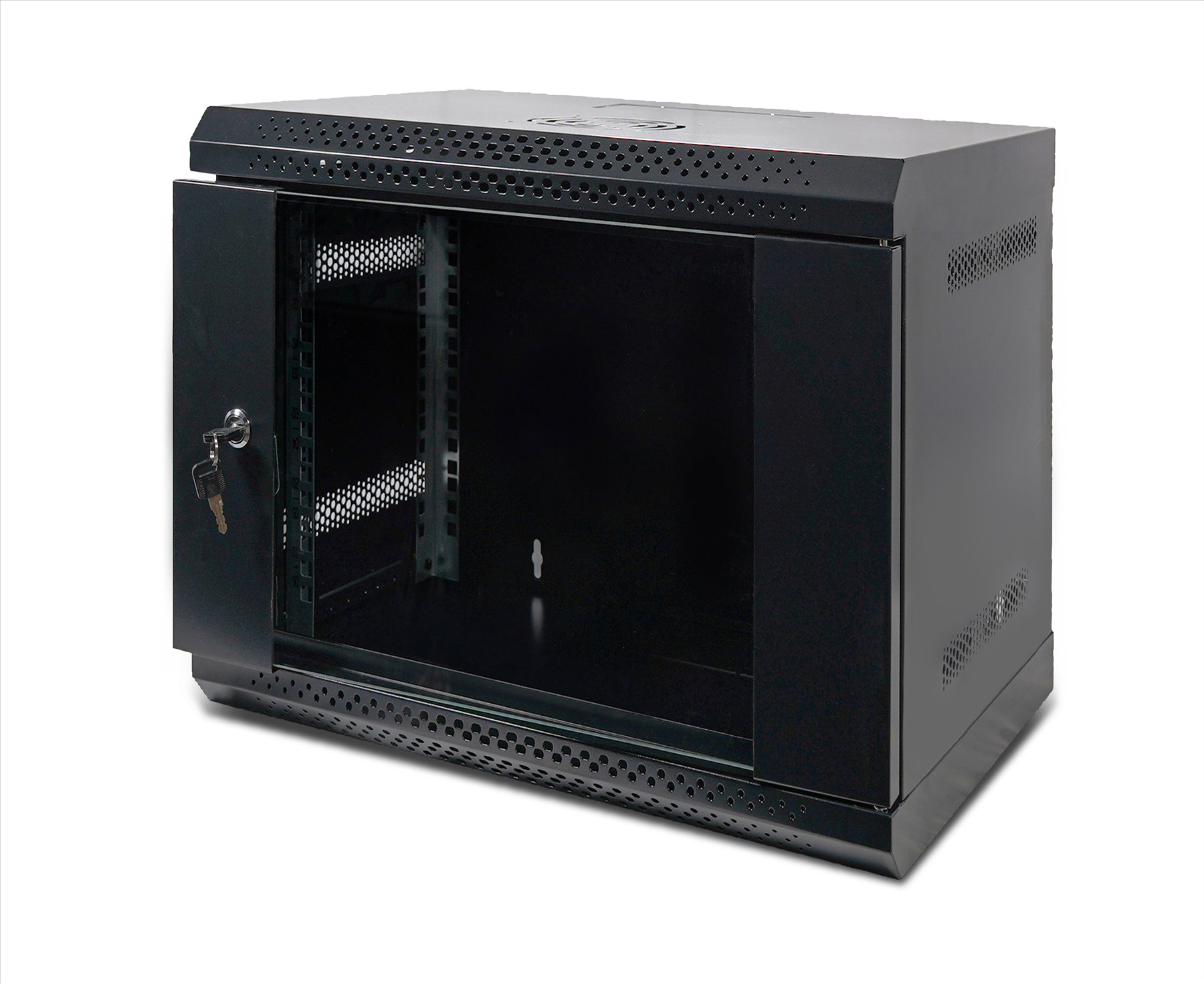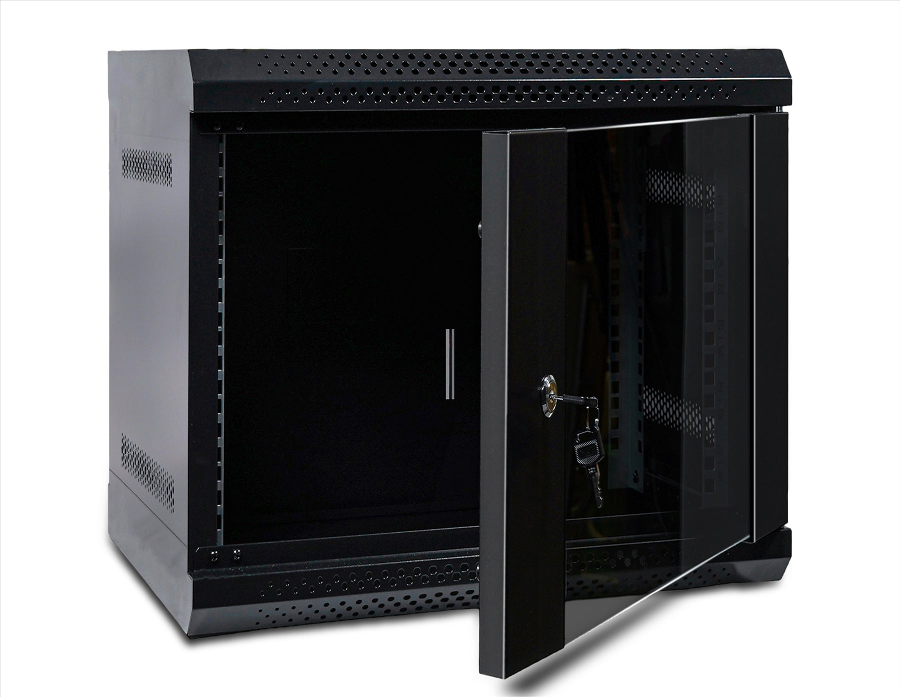 Maximize your network organization with the Eagle 19" Wall Rack Cabinet, designed for compact, secure, and efficient installations. Supplied fully assembled for quick setup, this wall-mounted cabinet is ideal for smaller networks, home offices, or workgroup systems. Built from durable SPCC cold-rolled steel with a sleek black powder coating, it offers outstanding reliability and professional aesthetics. The reversible, lockable tempered glass front door swings open 180°, providing full and easy access to your equipment. With adjustable mounting profiles and cable knockouts at the top, bottom, and rear, the Eagle Wall Rack offers exceptional flexibility and streamlined cable management.