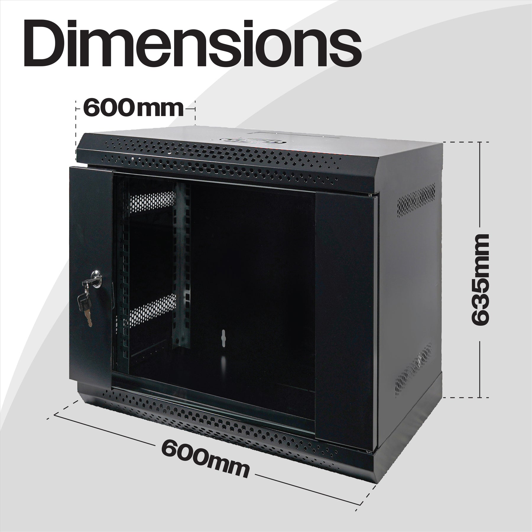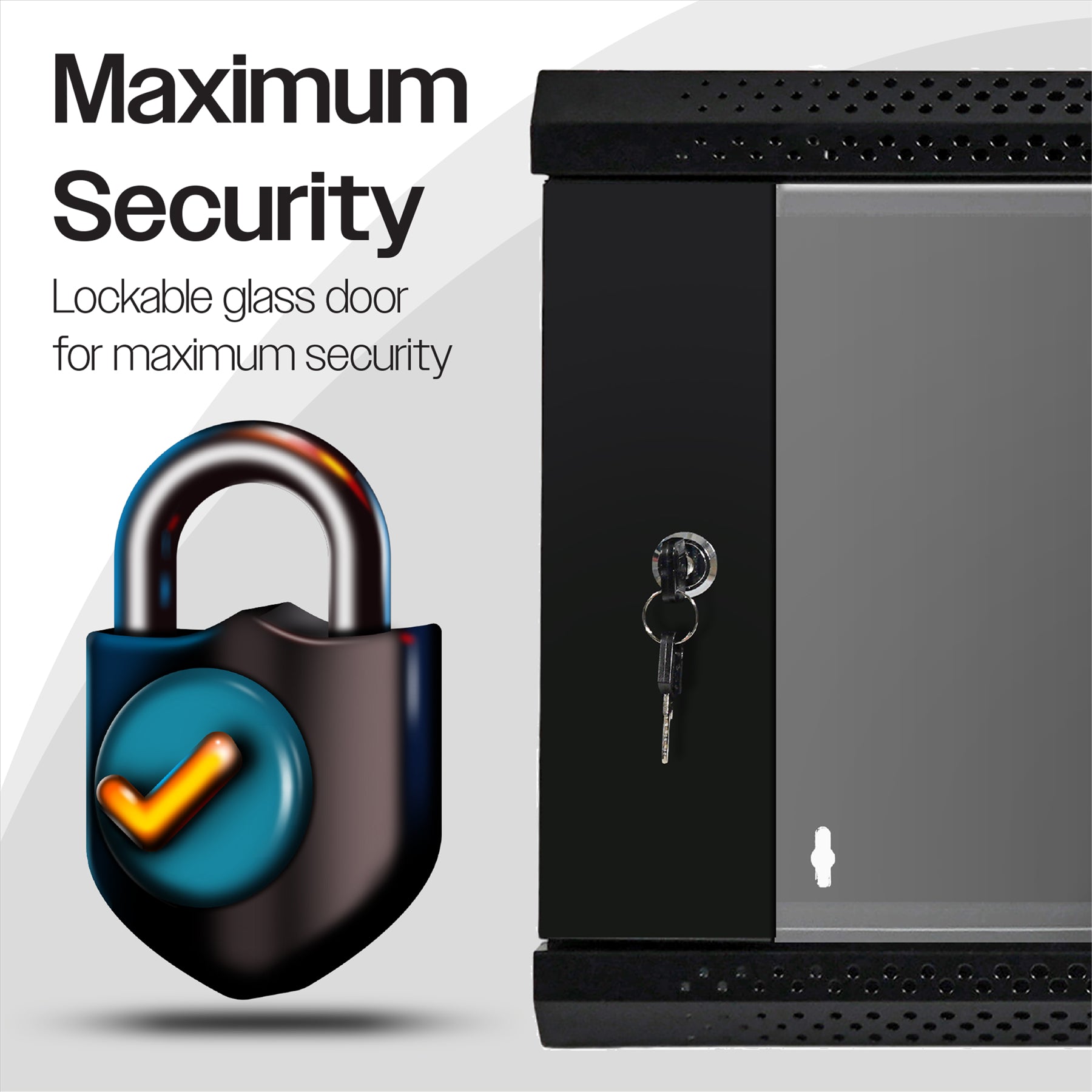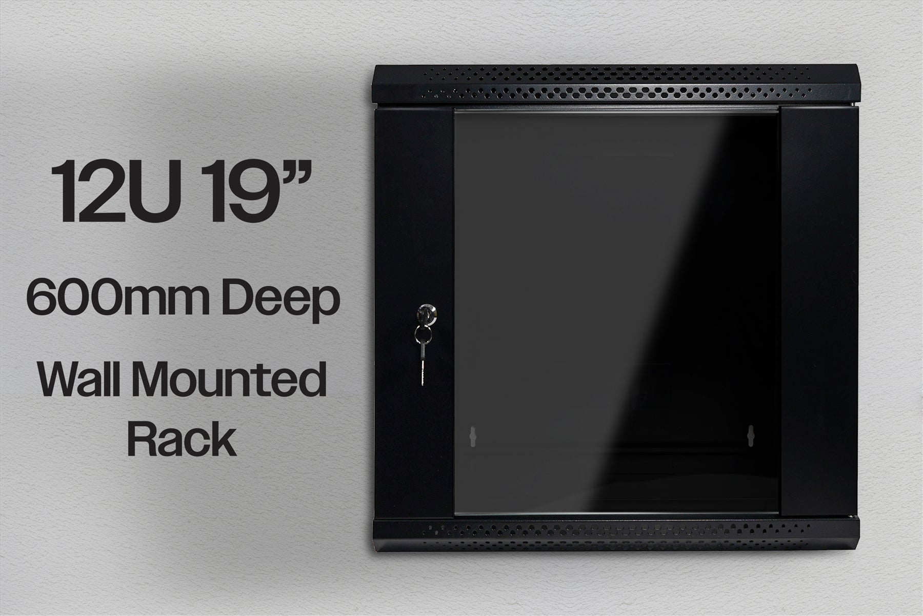 Maximize your network organization with the Eagle 19" Wall Rack Cabinet, designed for compact, secure, and efficient installations. Supplied fully assembled for quick setup, this wall-mounted cabinet is ideal for smaller networks, home offices, or workgroup systems. Built from durable SPCC cold-rolled steel with a sleek black powder coating, it offers outstanding reliability and professional aesthetics. The reversible, lockable tempered glass front door swings open 180°, providing full and easy access to your equipment. With adjustable mounting profiles and cable knockouts at the top, bottom, and rear, the Eagle Wall Rack offers exceptional flexibility and streamlined cable management.