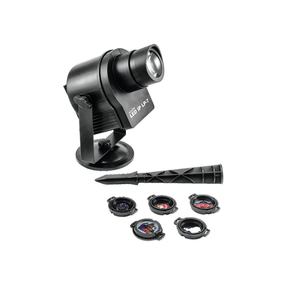 Projecteur de logos de petite taille pour projeter les motifs souhaités ou les logos publicitaires. Convient pour un usage externe (IP54). Le forfait comprend 6 gobos avec des motifs pour Pâques, Noël, Halloween, Nouvel An, mariage et anniversaire. Convient pour vos propres gobos avec un diamètre extérieur/image de 35/26 mm et changement facile de la feuille de gobo. Rotation statique ou lente du gobo sélectionnable, la vitesse de rotation peut être ajustée via la commande rotative.