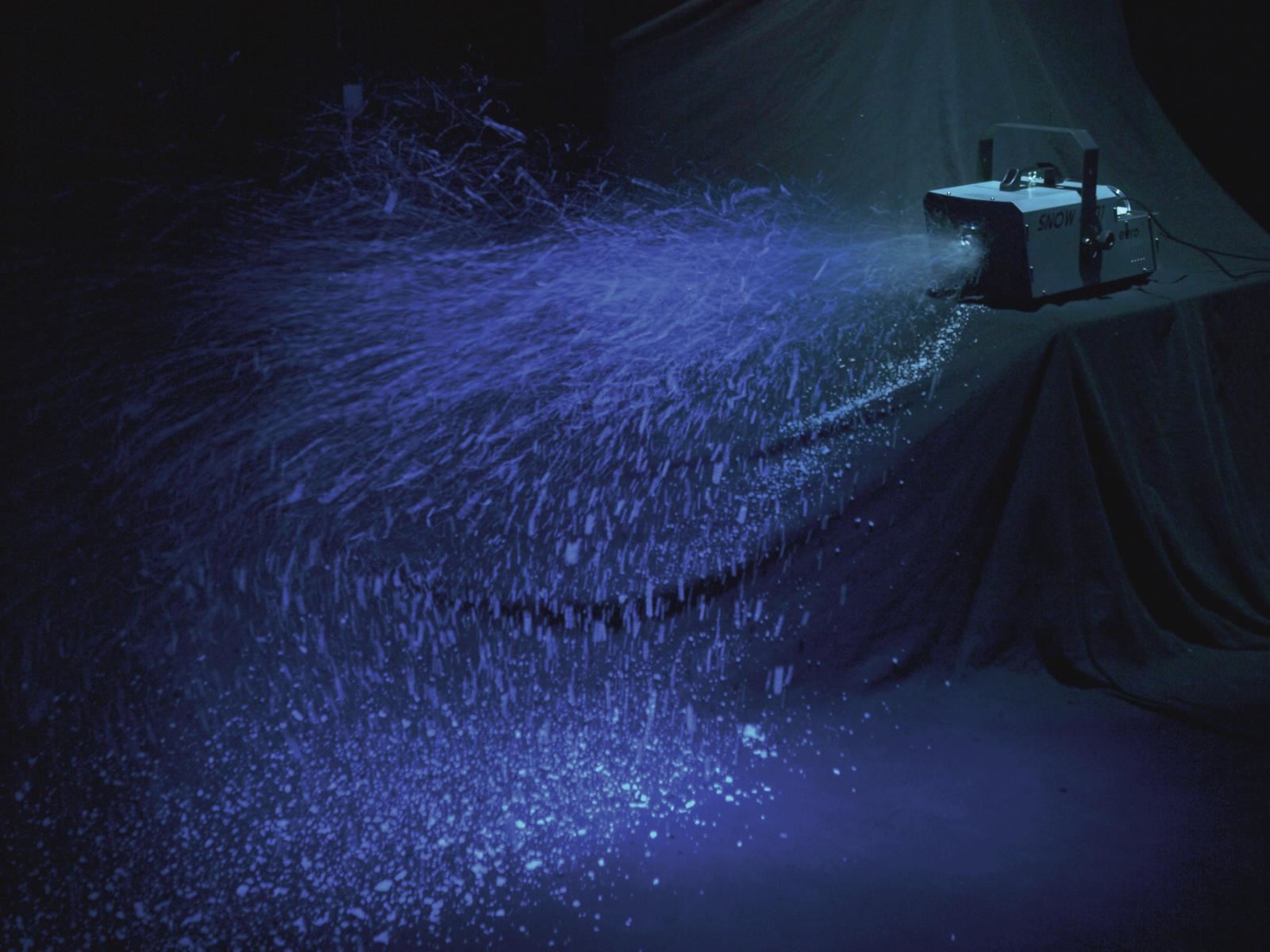 De nombreux flocons de neige sont projetés dans la pièce jusqu'à une distance de 2 m