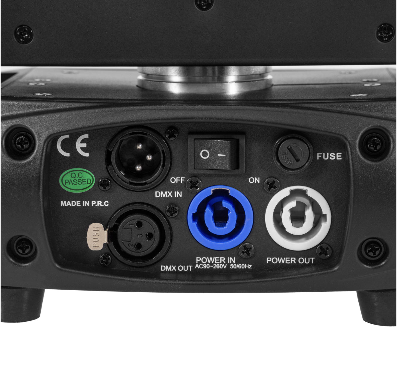 Control options include two DMX modes (12 or 14 channels), automatic programs, and sound-activated operation. The 1.8-inch TFT color screen provides easy navigation, and powerCON in/out connectors simplify power distribution. The included omega brackets make mounting quick and efficient.
