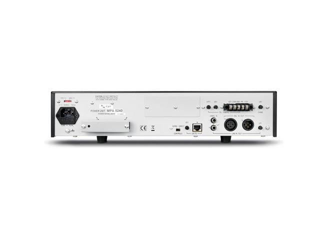 La série MPA booster dispose d'une entrée RJ45 pour la connexion aux bases de microphones pré-amplifiés MBT 1101 simplement au moyen de câbles blindés SFTP CAT.5E. Il y a une entrée symétrique spéciale (TEL/EMERG) avec transformateur et activation automatique de la priorité (VOX) sur le panneau arrière. Des commandes de réglage du niveau et du seuil d'activation sont présentes sur le panneau arrière. Cette entrée peut être utilisée pour connecter la sortie audio appropriée d'un standard téléphonique. Cet équipement dispose d'un grand nombre de dispositifs de protection contre les surcharges et les courts-circuits (un circuit limiteur de crête de courant de sortie, un disjoncteur thermique à l'intérieur du transformateur de puissance, un disjoncteur thermique réarmable en contact avec le dissipateur thermique du transistor de puissance, fusibles principaux). De plus, chaque unité dispose d'un ventilateur de refroidissement, avec contrôle automatique de la vitesse en fonction des températures des dissipateurs thermiques auxquels sont appliqués les dispositifs de puissance.