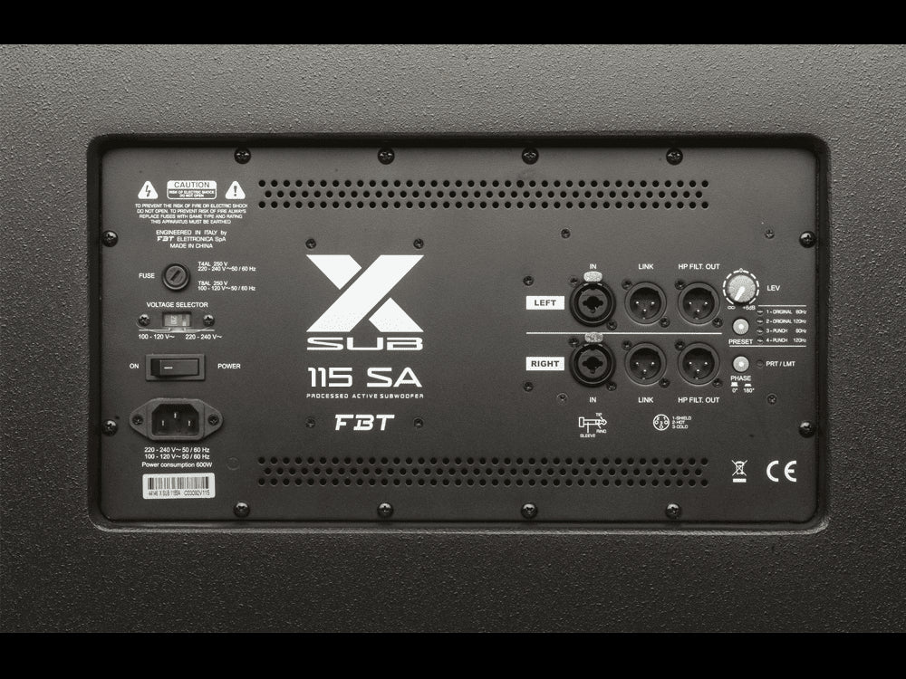 Le FBT X-SUB 115SA répond aux critères de performances suivants : réponse en fréquence de 42 Hz à 120 Hz à -6 dB, SPL maximum de 135 dB en crête, amplificateur Classe D de 1 200 W.