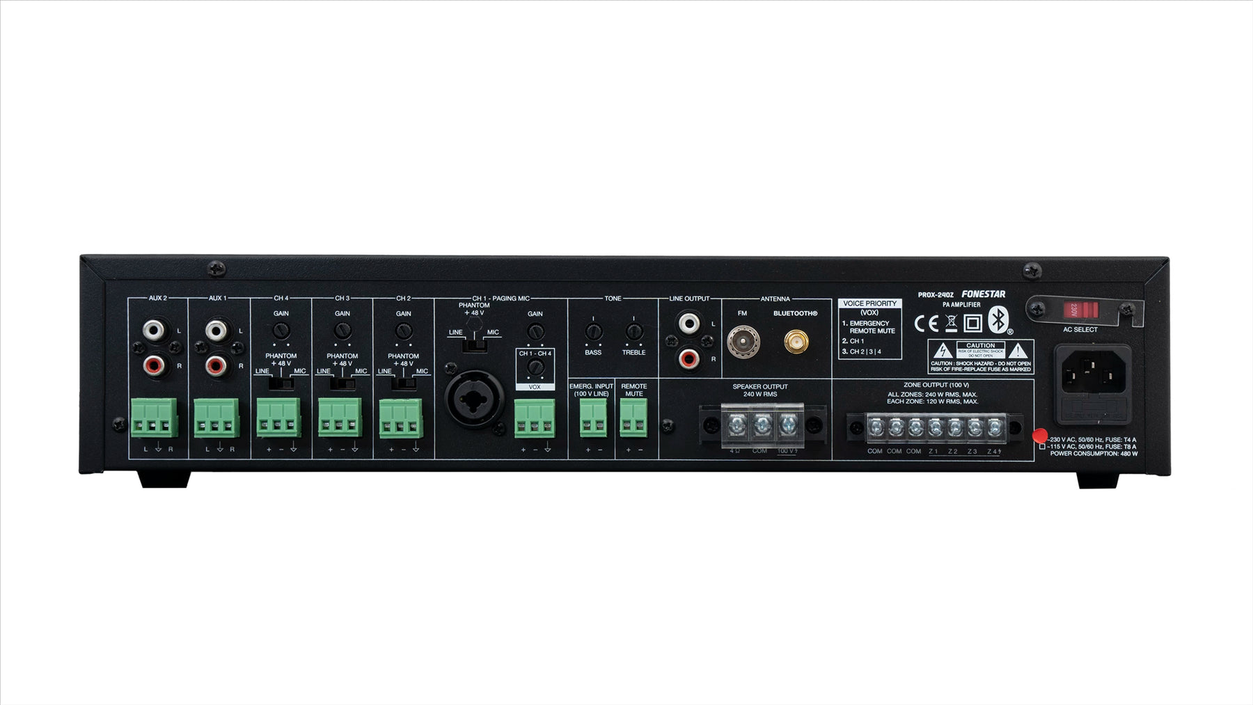 The Fonestar PROX-240Z is a 240W multi-zone mixer amplifier engineered for professional-grade audio distribution in commercial environments. With four independently controlled zone outputs, it enables precise volume management across multiple areas such as restaurants, offices, and retail spaces. Supporting both 100V line and 4Ω low-impedance speaker systems, the amplifier adapts easily to various installation requirements. Its integrated media player with Bluetooth, USB, and FM radio ensures seamless music playback, while the auto-play function provides hassle-free operation after power cycles. Designed for paging and announcements, it features a VOX-priority mic input and four mic channels with selectable phantom power. Additional aux inputs accommodate external media, and an emergency mute input allows integration with safety systems, making the PROX-240Z a reliable, all-in-one audio solution.