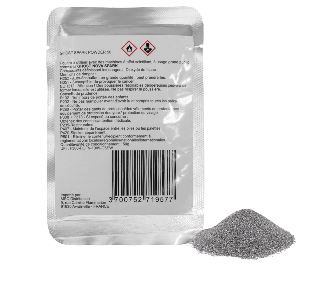 Ghost Spark Powder 50 is the essential accessory for extending your light shows. This 50g sachet contains a metallic powder made from an alloy of titanium and zirconium, specially formulated to generate impressive sparks with your compatible machines.