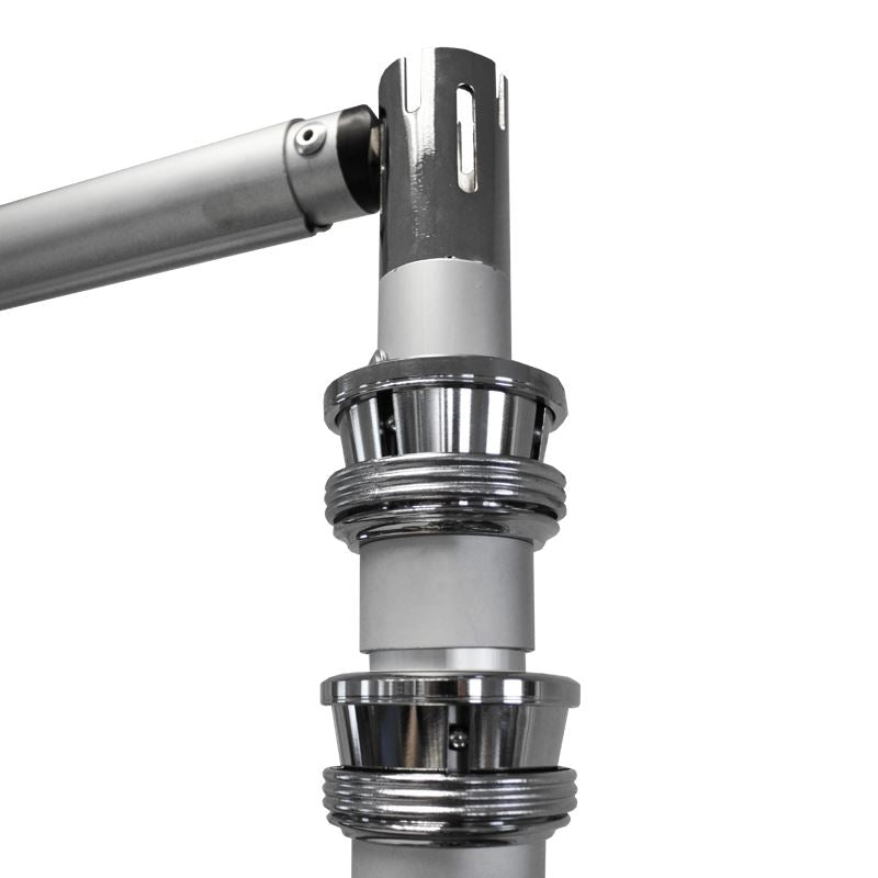 La gamme Curtain Call Pipe and Drape comprend 1 section verticale fixe, 3 sections verticales télescopiques réglables en hauteur et 2 sections télescopiques réglables en largeur, ainsi que des plaques de base, permettant la création facile de cloisons, de séparateurs et de vestiaires entièrement variables dans n'importe quel espace.