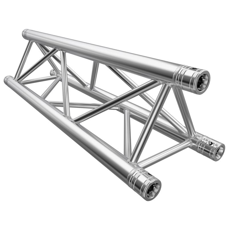 Le Global Truss F33 est doté d'un soudage en aluminium certifié TUV et d'une épaisseur de paroi de 2 mm pour une superbe capacité de manutention de charge. Une gamme complète de longueurs, de plaques de base, de coins, de connecteurs et de coupleurs est disponible, ce qui les rend idéaux pour les installations fixes, l'aménagement de magasins et les applications de location. Des connecteurs coniques avec broches et clips R sont fournis avec chaque pièce pour un assemblage rapide.