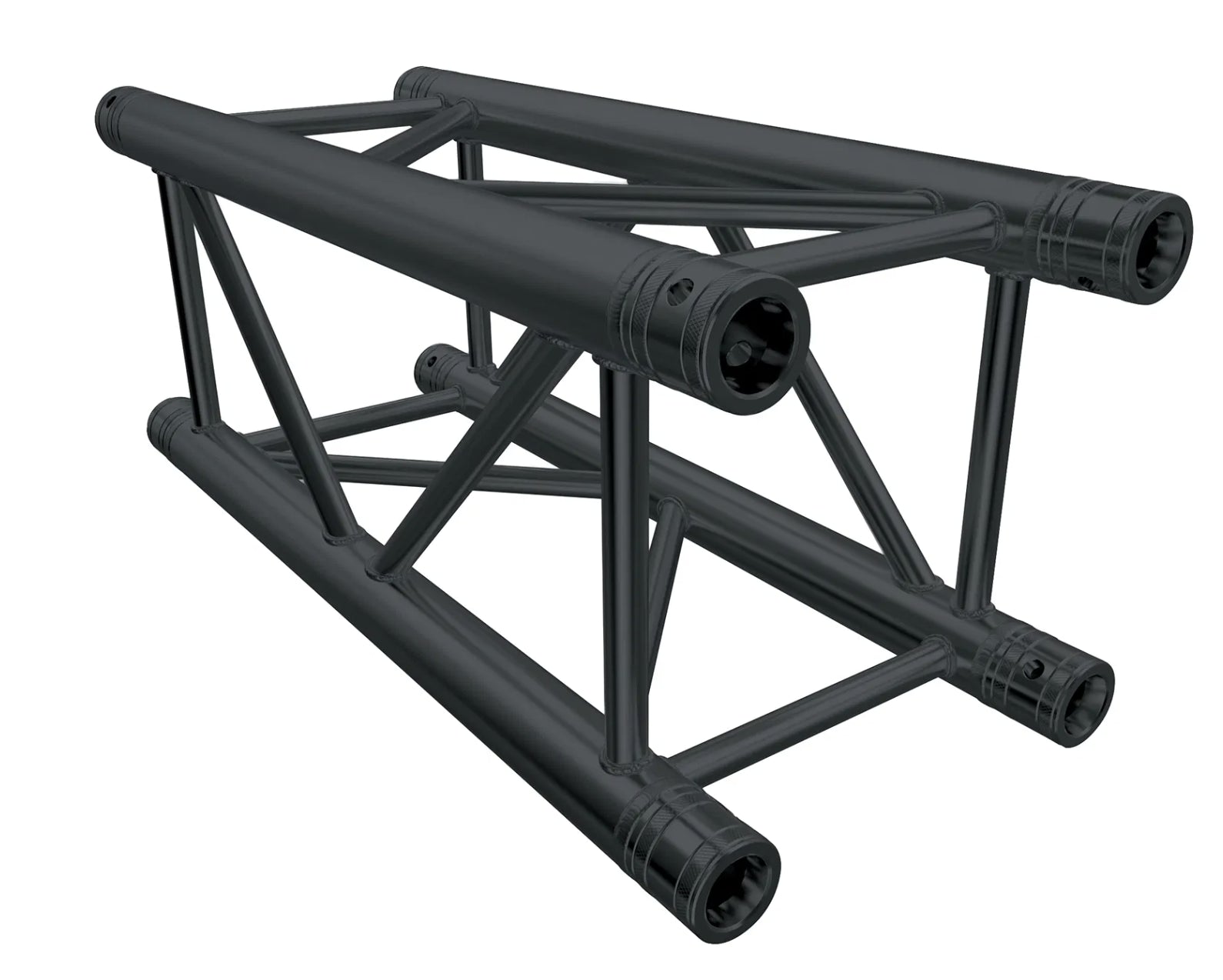 The F34 truss series by Global Truss is a TÜV approved 4-point system with an external dimension of 29cm. With its excellent load capacity relative to weight and size, the F34 system is one of the most widely used in the industry. From exhibition stands and shop fittings to stage roofs and outdoor structures, F34 truss offers versatility and strength. Constructed from 50x2mm main tubes and 20x2mm diagonal braces of aluminium, each section is supplied with conical connectors for secure assembly. This black powder-coated version provides a professional finish suitable for stage and event environments. The system can also be powder coated in any RAL colour on request.