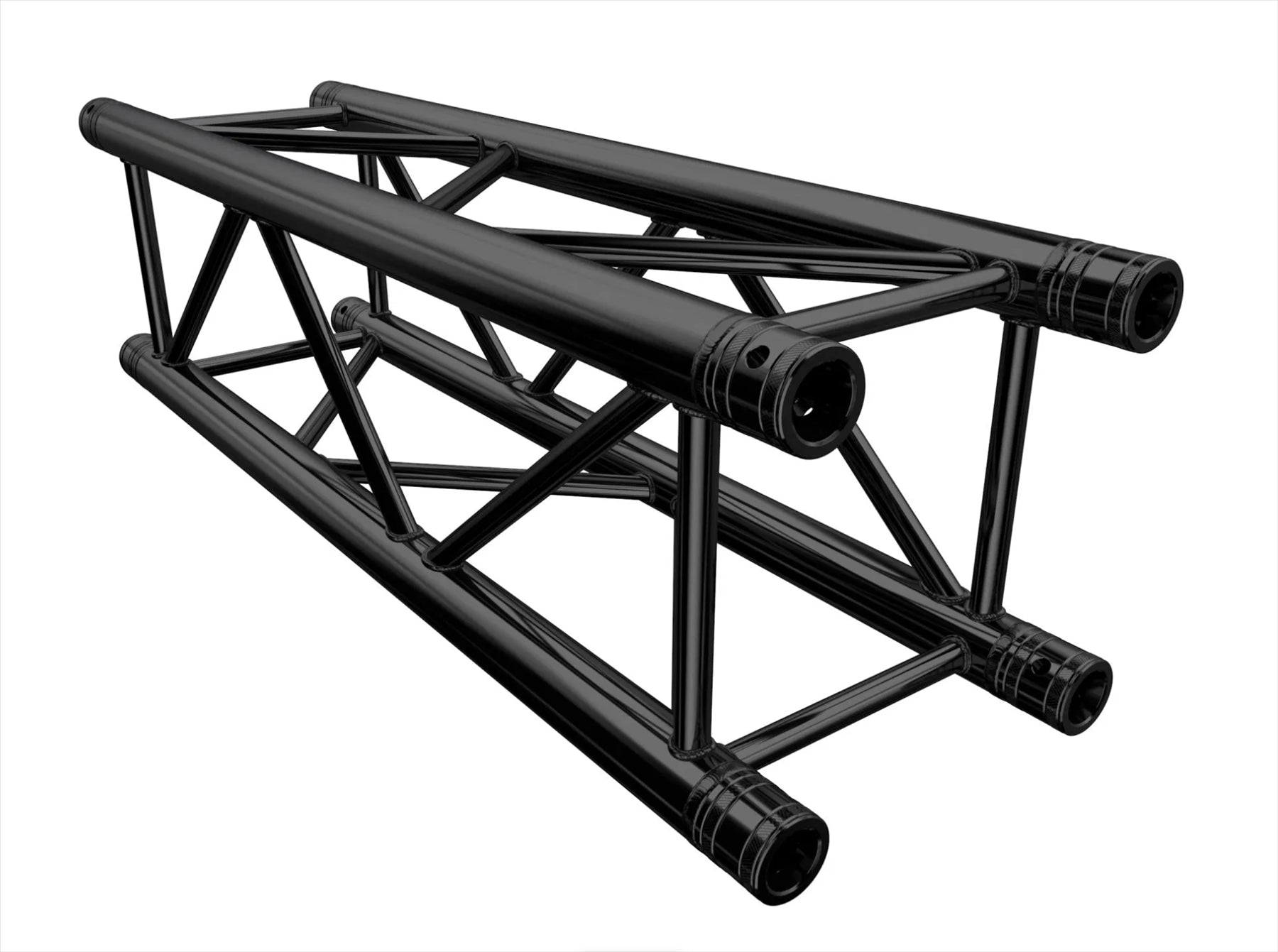 The F34 truss series by Global Truss is a TÜV approved 4-point system with an external dimension of 29cm. With its excellent load capacity relative to weight and size, the F34 system is one of the most widely used in the industry. From exhibition stands and shop fittings to stage roofs and outdoor structures, F34 truss offers versatility and strength. Constructed from 50x2mm main tubes and 20x2mm diagonal braces of aluminium, each section is supplied with conical connectors for secure assembly. This black powder-coated version provides a professional finish suitable for stage and event environments. The system can also be powder coated in any RAL colour on request.