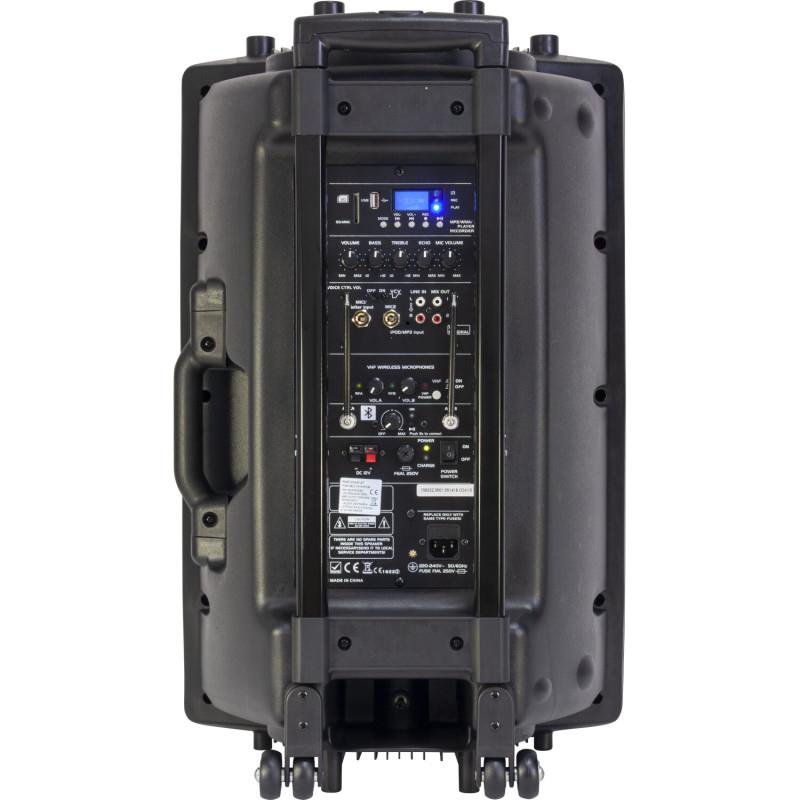 En plus de sa qualité sonore exceptionnelle pour cette catégorie de produit, ce système portable offre des fonctionnalités importantes telles qu'une batterie rechargeable incluse et une double alimentation (12V & 220V), une poignée rétractable et des roulettes. Il offre une totale liberté de mouvement dans n'importe quelle application grâce aux 2 microphones VHF sans fil (micros casque et main, une télécommande et diverses entrées et sorties pour s'adapter à tous types de sources, y compris les ports USB/MP3, SD/MMC et iPod. .