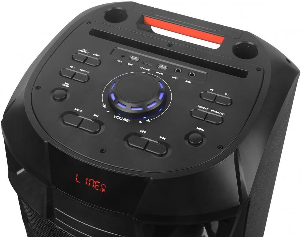 The Intimidation HTM-7011 is a powerful and versatile sound system designed to elevate any event or gathering. Equipped with dual 10” drivers and a maximum power output of 9500W, this system delivers deep bass and crystal-clear audio across a wide frequency range of 150Hz to 18kHz. The HTM-7011 offers a variety of input options, including USB, TF card, Bluetooth, FM Radio, Aux, and RCA inputs, allowing seamless connection to your favorite devices. With user-friendly features like volume and mic volume controls, EQ modes, and LED light control, you can customize your experience to suit any mood. The system also includes Mic Priority and Record & Play modes for added functionality, supported by a 7A – 12V battery, ensuring long-lasting playtime for any occasion.