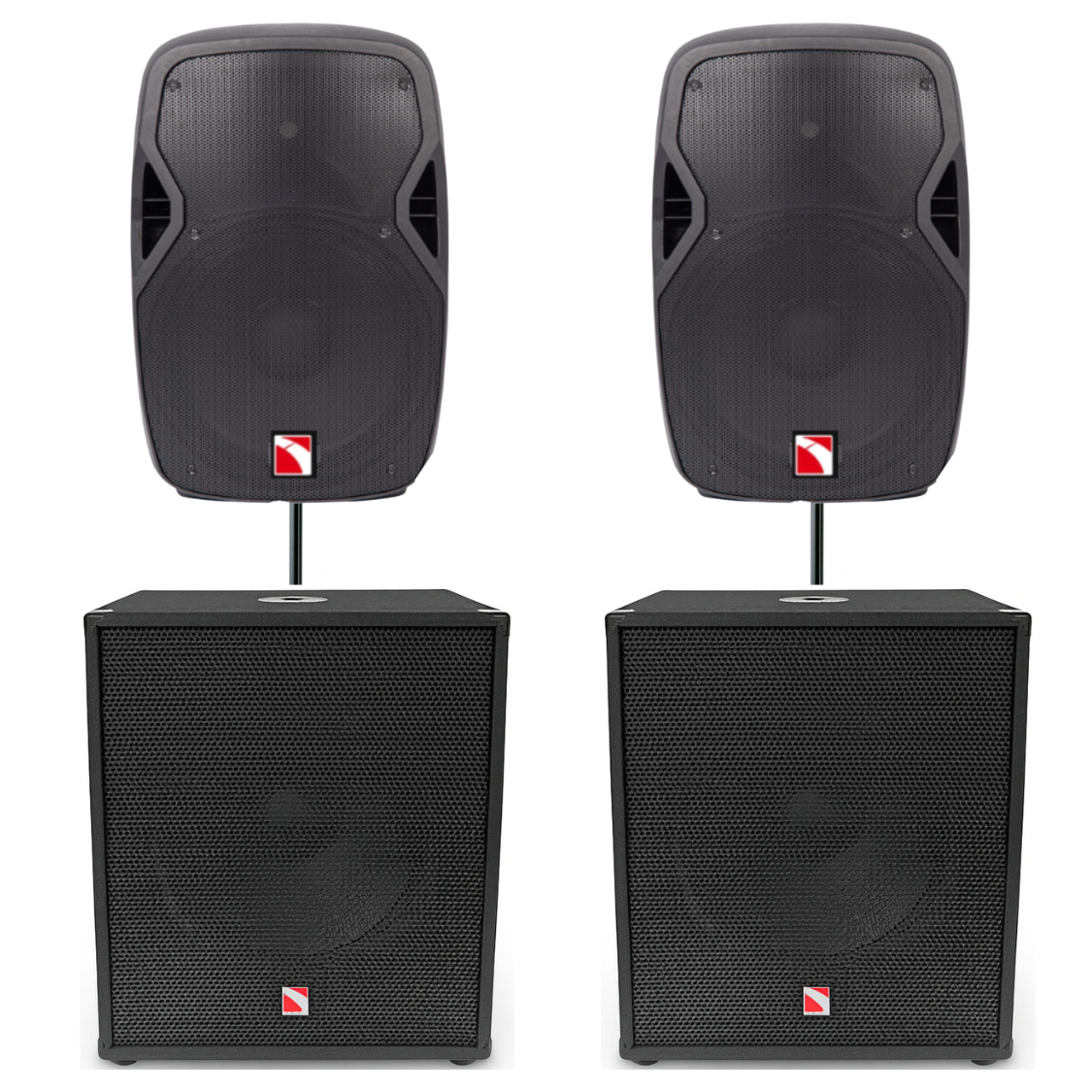 Complete sound system bundle with 2 active PA speakers, 2 active subwoofers, and 2 speaker poles