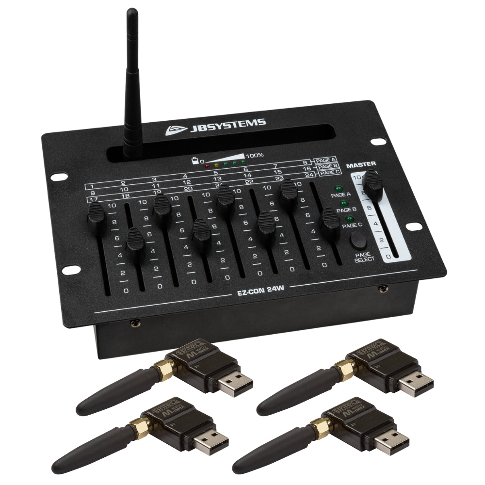 Ce pack comprend 1 contrôleur DMX EZ-CON 24 W Jb Systems et 4 dongles DMX sans fil WTR-DMX.
