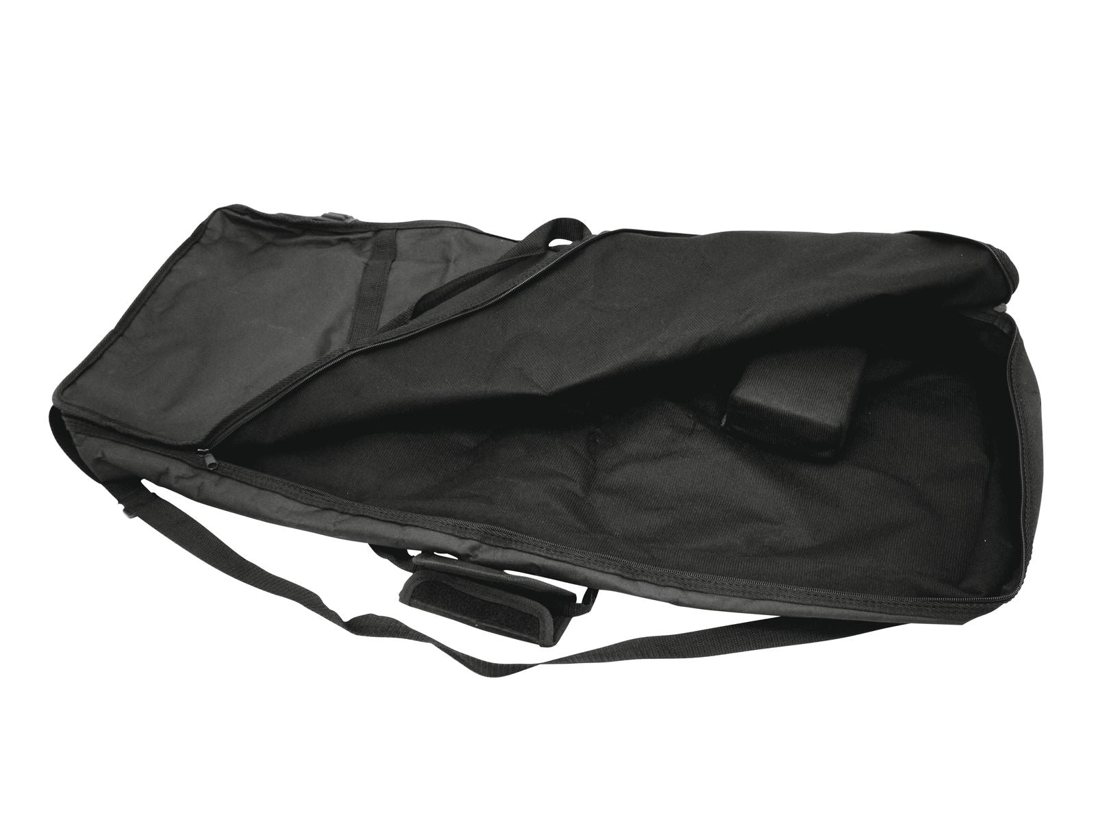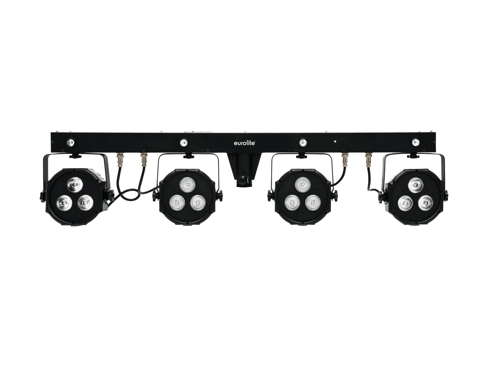 Barre avec 4 spots RGB, LED stroboscopiques blanc froid + UV, pédale de commande et sacoche