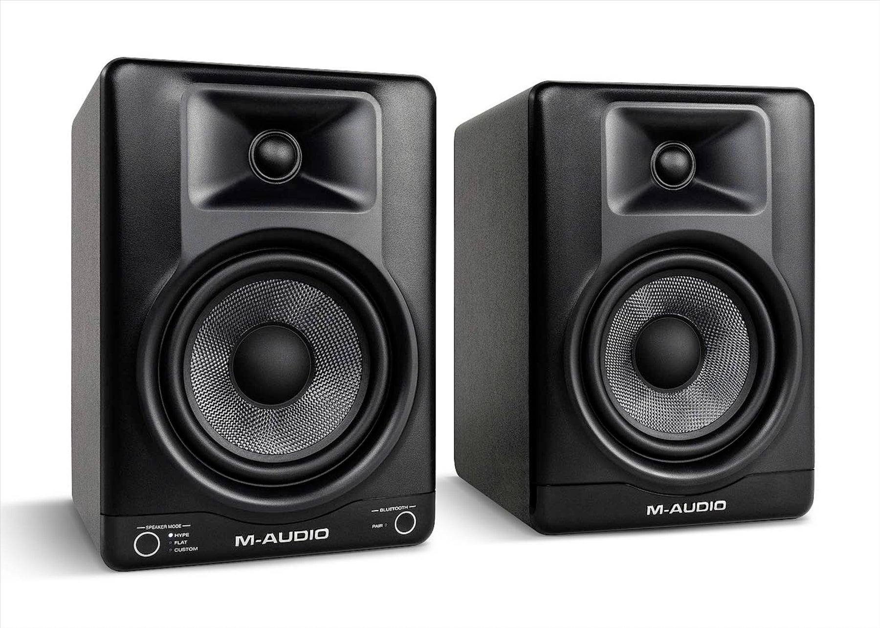 The M-Audio BX5BT studio monitors combine professional-grade sound with modern convenience, making them an ideal choice for music producers, gamers, content creators, and video editors. With 120 watts of bi-amplified power, a 5” Kevlar woofer, and precision DSP-based crossover, these compact monitors deliver crystal-clear audio with deep bass. Users can seamlessly switch between reference-grade FLAT and enhanced HYPE modes using the front panel control or dive deeper into customization with the M-Audio Studio Control App, which provides access to a five-band EQ and user presets. Built-in Bluetooth 5.0 connectivity enables wireless streaming from any device and any app. Delivering premium sound quality in a small footprint, the BX5BT desktop studio monitors are designed to meet the needs of any creative workflow.