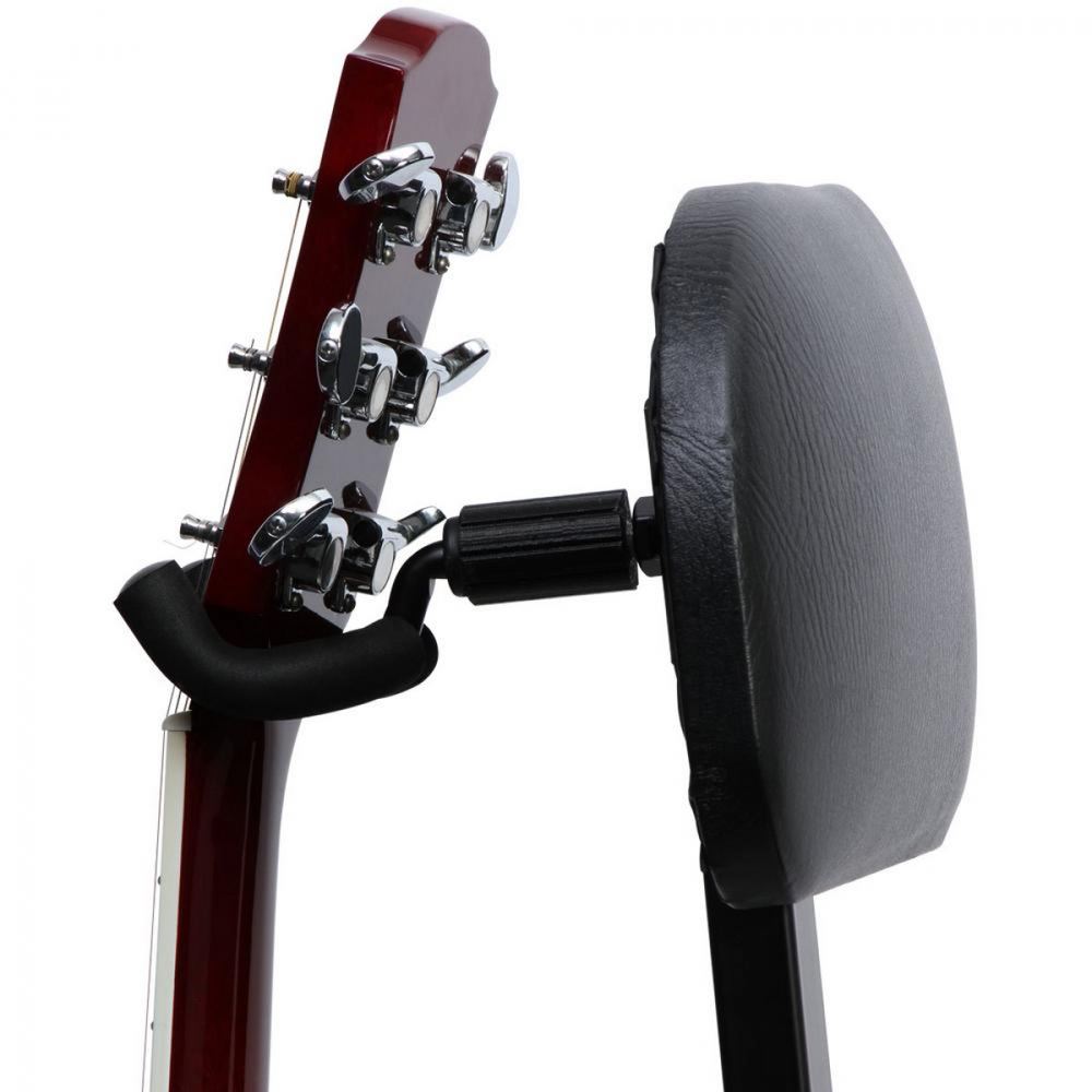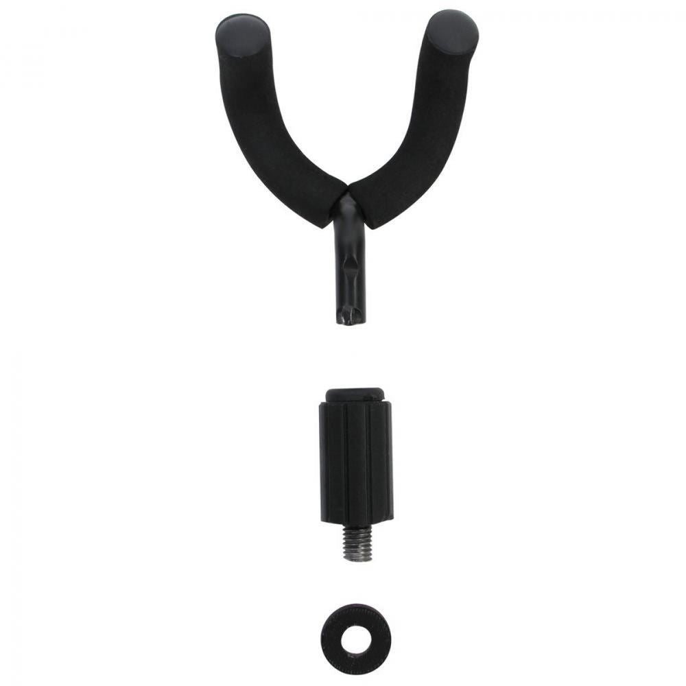 Now your musicians stool can be your guitar stand, too! The GS7710 features a padded guitar yoke designed to work with our DT8500 Musicians Stool. A threaded sleeve screws into the back of the DT8500™ back rest, and can stay there for transport or when you don™t need to hang a guitar. The yoke itself attaches to the sleeve via a secure keyhole design similar to our most popular guitar stands. The GS7710 will handle guitars, basses, and other instruments up to 12lbs. Compatible with the DT8500 Guitar Throne (not included) M10 threading provides a secure connection to the backrest of the DT8500 Fits most guitars, basses, and other stringed instruments Handles up to 12lbs Self-adjusting swivel yoke lets your guitar hang straight Padded with velveteen rubber