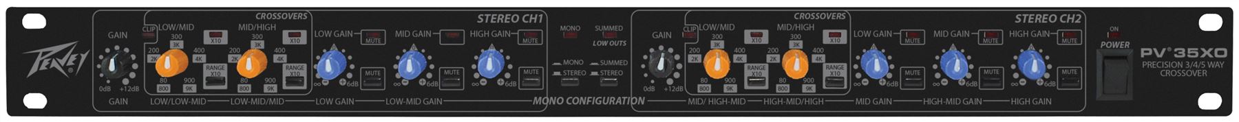 Configurable for 3-way stereo or 4-way and 5-way mono operation, the PV 35XO crossover features variable-state controls and 24dB/octave LR filters, with XLR inputs and outputs on each channel for balanced operation from 20Hz to 20kHz. In addition, there are mute capabilities for each output level control, a low-sum output jack to sum the low-frequency stereo content and phase inversion on each band pass output (except low sum). Weight: 5.0lbs / 2.268kg.