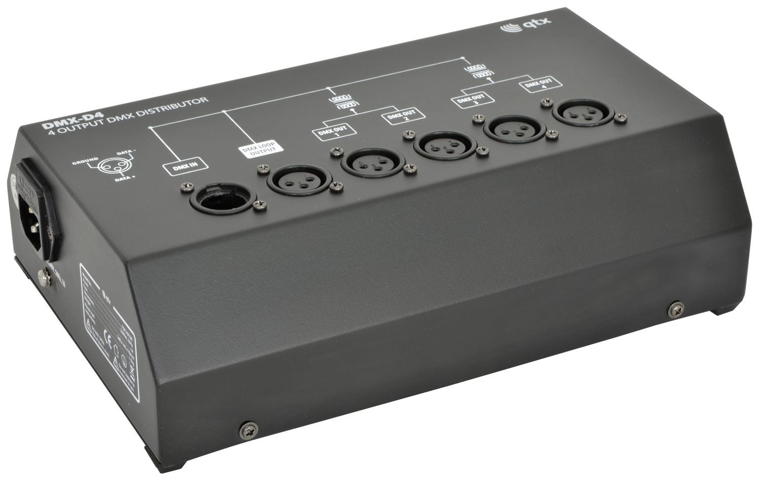 Ce booster/distributeur DMX à 4 voies possède une entrée, une boucle et deux sorties opto-isolées électriquement. L'entrée et la sortie DMX sont fournies avec des connecteurs XLR à 3 broches, ce qui les rend universellement compatibles avec la plupart des systèmes d'éclairage. Cet élément est idéalement utilisé pour diviser le signal sur une grande surface plutôt que pour faire fonctionner une chaîne. Le boîtier isolera les sous-chaînes individuelles, ce qui permettra de protéger et de corriger rapidement et facilement les défauts lorsqu'ils surviennent sans que l'ensemble du système ne tombe en panne.