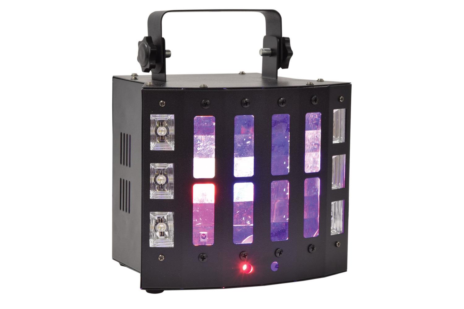 Luminaire compact avec 4 effets dynamiques et colorés différents. L'effet derby principal est alimenté par 9 LED de couleurs différentes délivrant des faisceaux torsadés sur une large zone. Chaque côté de la fenêtre principale du derby se trouve 3 LED bicolores pour les lavages ultraviolets ou les effets stroboscopiques blanc froid.