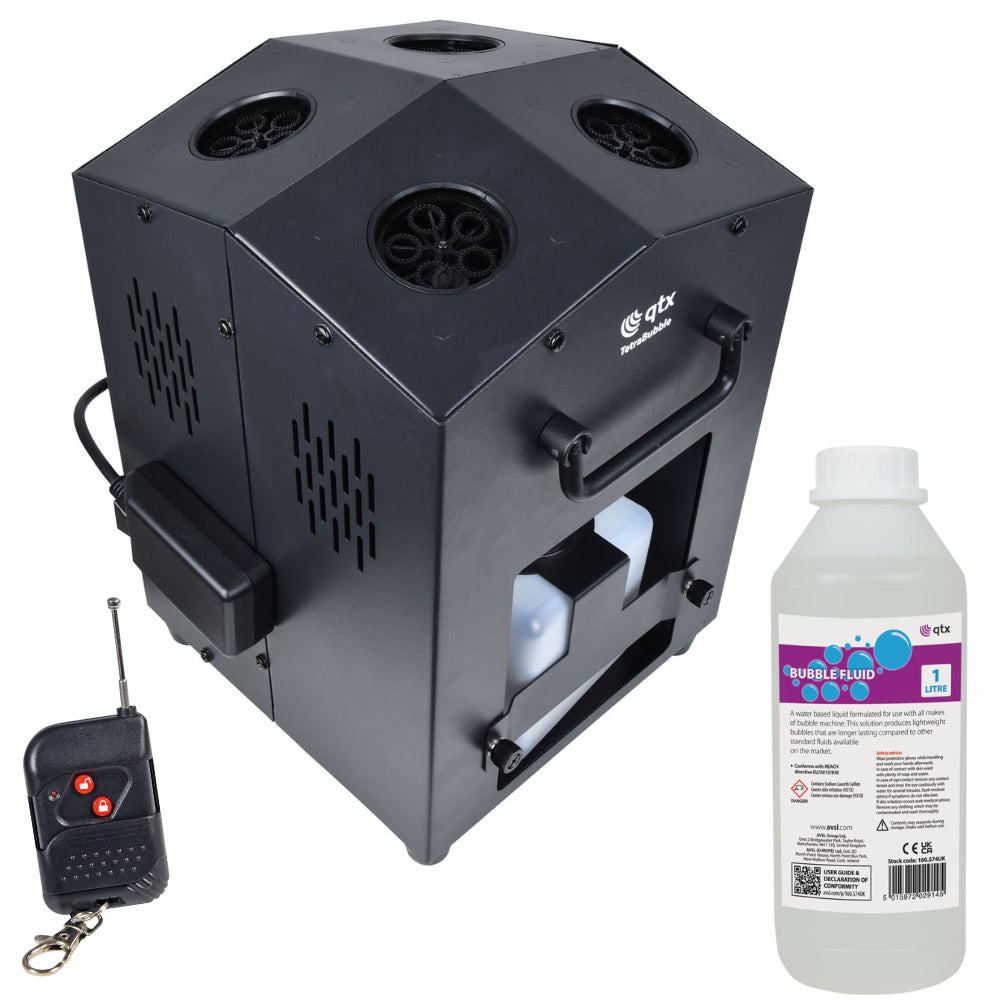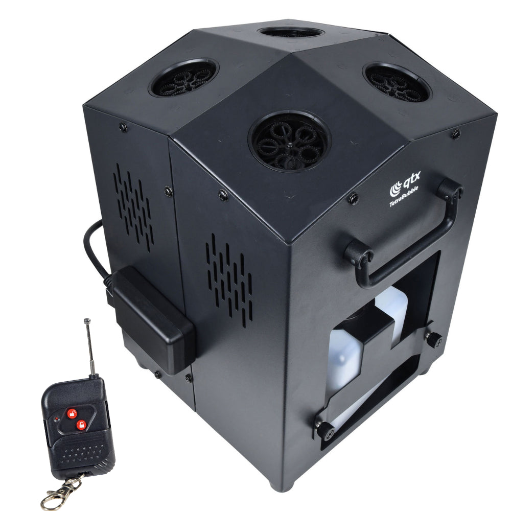 Compact, yet powerful the Tetra Bubble delivers an impressive vertical torrent of bubbles up to 5m high. The innovative design provides a high output of bubbles from 4 small wheels and the removeable fluid tank makes filling and emptying easy with minimal mess or fuss. The included wireless remote provides simple control away from the main unit and the folding carry handle makes moving the unit from one gig to the next a breeze.