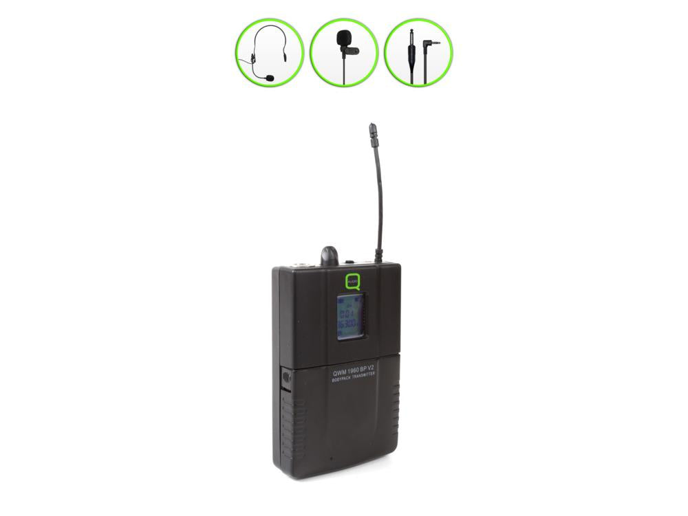 The QWM 1960 BP KIT V2 is a versatile UHF wireless bodypack transmitter system designed for performers, presenters, and musicians who require flexibility and reliable wireless performance. The kit includes a bodypack transmitter, lavalier microphone, headset microphone, and instrument cable—making it suitable for vocals, speech, and instrument use. Operating in UHF Channel 38 (606–614 MHz) or Channel 70 (863–865 MHz), it offers clear transmission with a working distance of up to 50 meters. The unit features a backlit display, ACT infrared pairing, and a 3.5mm screw jack connection for secure mic attachment.