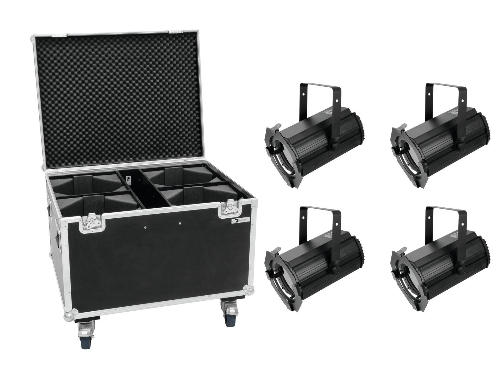 4x Fresnel spot, 100 W warm white LED, extremely quiet, DMX including PRO flightcase