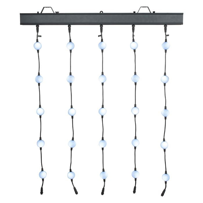 L'ensemble Showtec Pixel Bubble 75 est une matrice de 75 boules RVB blanches givrées de 50 mm (2") avec contrôle individuel des pixels, adaptée pour créer un bel effet visuel en intérieur. L'ensemble comprend un bloc d'alimentation à 5 sorties et 15 alimentations 1- en série. m (3,28 pieds), chacune équipée de 5 boules LED multicolores. Des chaînes supplémentaires sont facultatives puisque chaque sortie d'alimentation peut alimenter jusqu'à 6 chaînes connectées en série. Le Pixel Bubble 75 Set dispose d'un système de montage innovant pour un montage facile. En outre, il dispose de plusieurs options de contrôle, comme DMX, Maître/Esclave, Art-Net, Kling-Net et peut être utilisé comme appareil autonome avec des programmes intégrés.