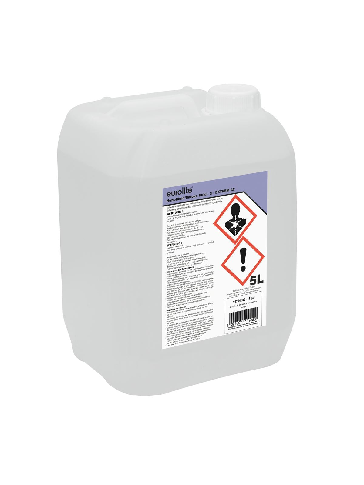 Fluide fumigène Eurolite - Fabriqué en AllemagneLa confiance est bonne, le contrôle est bien sûr meilleur - c'est pourquoi nous testons nos fluides fumigènes selon les normes en vigueur pour répondre aux exigences légales, par exemple la loi REACH. Il doit y avoir des raisons pour lesquelles un produit jouit de la confiance du public depuis plus de deux décennies. Il doit y avoir des raisons pour lesquelles nous avons vendu plus d'un million d'unités de fluide fumigène en 20 ans. La qualité et la fiabilité sont les éléments décisifs du succès. Nos clients savent qu'ils obtiennent un produit de première qualité avec les fluides Euro?lite. Pour être haut de gamme, un produit doit faire plus que simplement fonctionner : il doit garantir qu'il ne soit pas nocif pour la santé. Cela peut paraître un peu trop dramatique, mais la vérité est la suivante : les liquides impurs peuvent gravement affecter le système respiratoire. De plus, les liquides facilement inflammables peuvent provoquer de graves dommages. De nombreux prestataires ne se soucient pas de ces dangers. Chez Steinigke, nous testons nos fluides de manière rigoureuse. De plus, nous laissons des organismes indépendants contrôler en permanence les liquides. Nous pouvons donc garantir que nos liquides sont -à base d'eau-inodores-sans glycérine-non toxiques-non nocifs pour la santé-facilement biodégradables-non inflammables.Tous les utilisateurs nos fluides fumigènes nous accordent sa confiance. Nous le remboursons par des contrôles stricts de ces liquides et les deux parties gagnent.