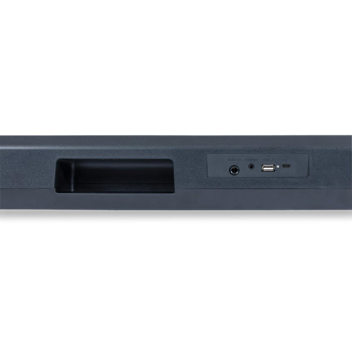 Connectors: USB-C input for power and charging, Headphones, Sustain Pedal, USB A jack for charging external devices