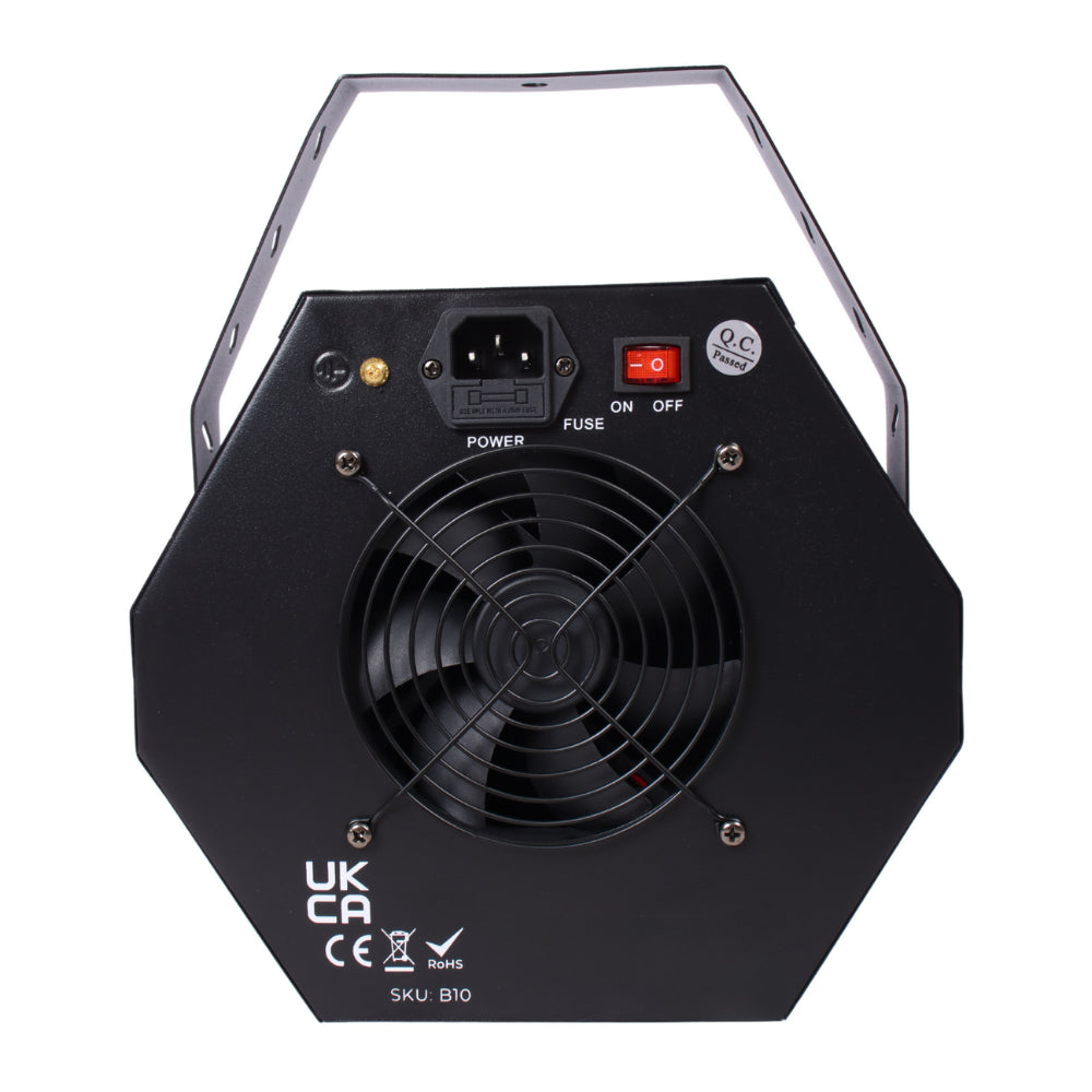 A critical feature of the Thor B10 is the Mains switch located on the rear, providing straightforward power control. The high-power fan is an essential component, ensuring efficient and effective bubble production. For added convenience, this bubble machine includes a removable fluid tray, making maintenance and refills a breeze.