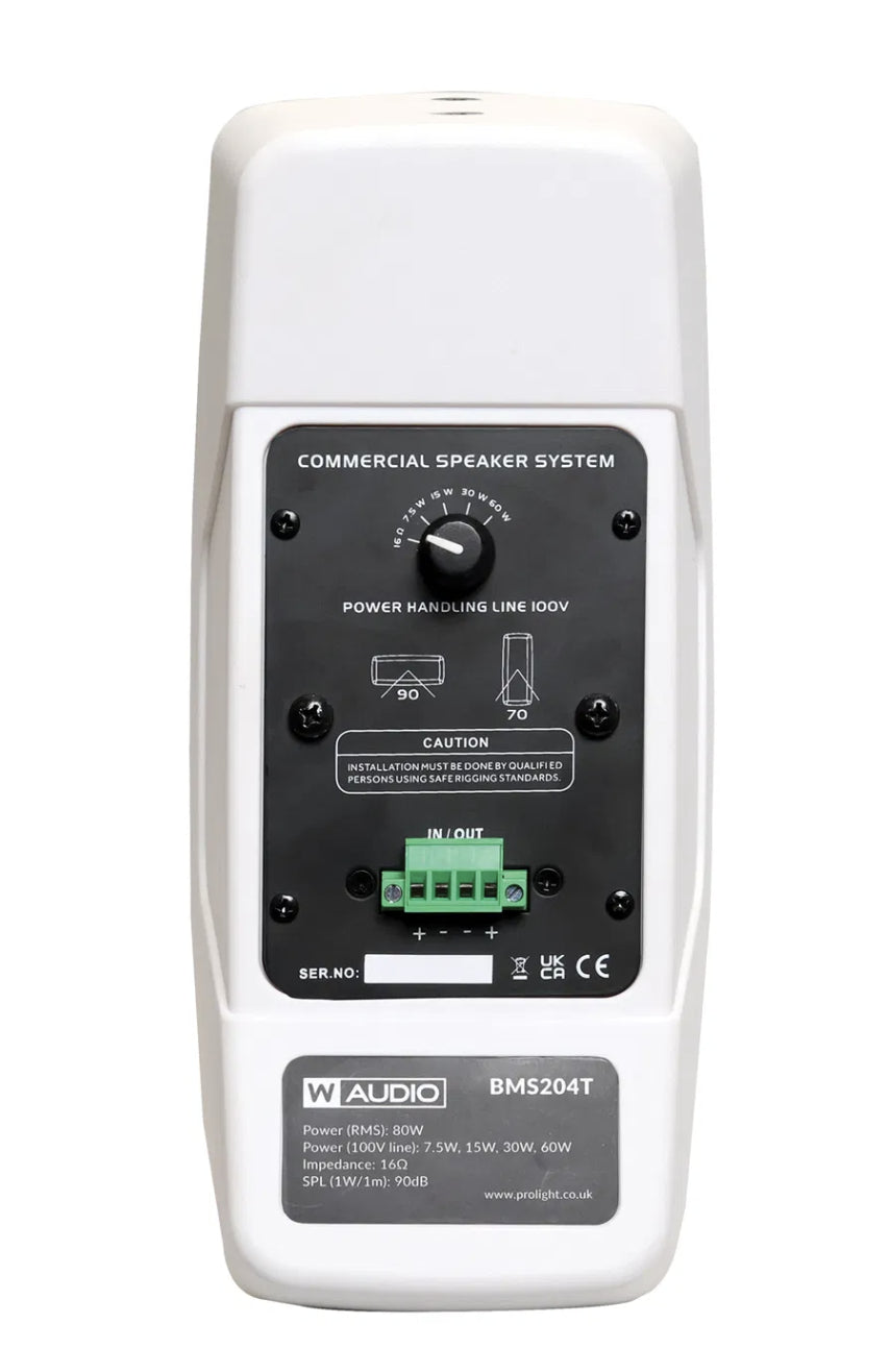 The W Audio BMS204 Series is a versatile speaker range designed for commercial audio installations, available in both low impedance and 100V line versions. Featuring dual 4” mid/low-frequency drivers and a ¾” high-frequency horn, these speakers deliver clear, natural sound reproduction for both music and speech, maintaining a flat frequency response.