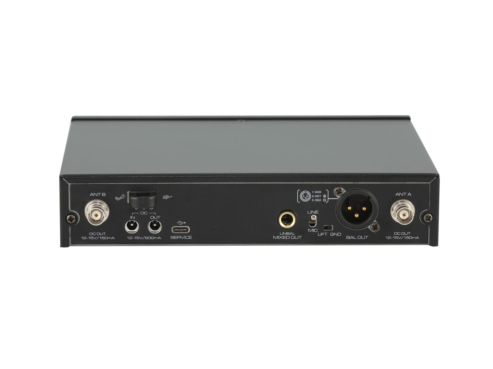 | Connexions: | 2 x antenne via BNC (F) 12-15 V Sortie : 1 x micro/ligne via XLR 3 broches Sortie : 1 x micro/ligne via prise jack 6,3 mm (mono) version de montage |
