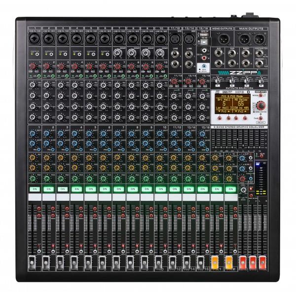 Mélangeurs PROFESSIONNELS avec multieffets DSP et Bluetooth. La solution idéale pour tout garder sous contrôle. Idéals pour les installations fixes ainsi que polyvalents pour les applications mobiles, ils peuvent facilement gérer les microphones pour une production théâtrale ou les entrées pour un concert d'un groupe. Les 2 sorties AUX garantissent une excellente autonomie pour les performances live et pour connecter du matériel externe en studio. Les effets internes, la connectivité Bluetooth, la carte son intégrée et le lecteur mp3 complètent les fonctionnalités impressionnantes de ces tables de mixage puissantes et polyvalentes. Table de mixage analogique compacte avec DSP 32 bits intégré et carte son full duplex, 99 effets, connectivité Bluetooth et lecteur multimédia. 4 groupes de sorties auxiliaires sélectionnables indépendamment, avec sélecteur matriciel. EQ 9 bandes sur le master. Alimentation fantôme +48 V