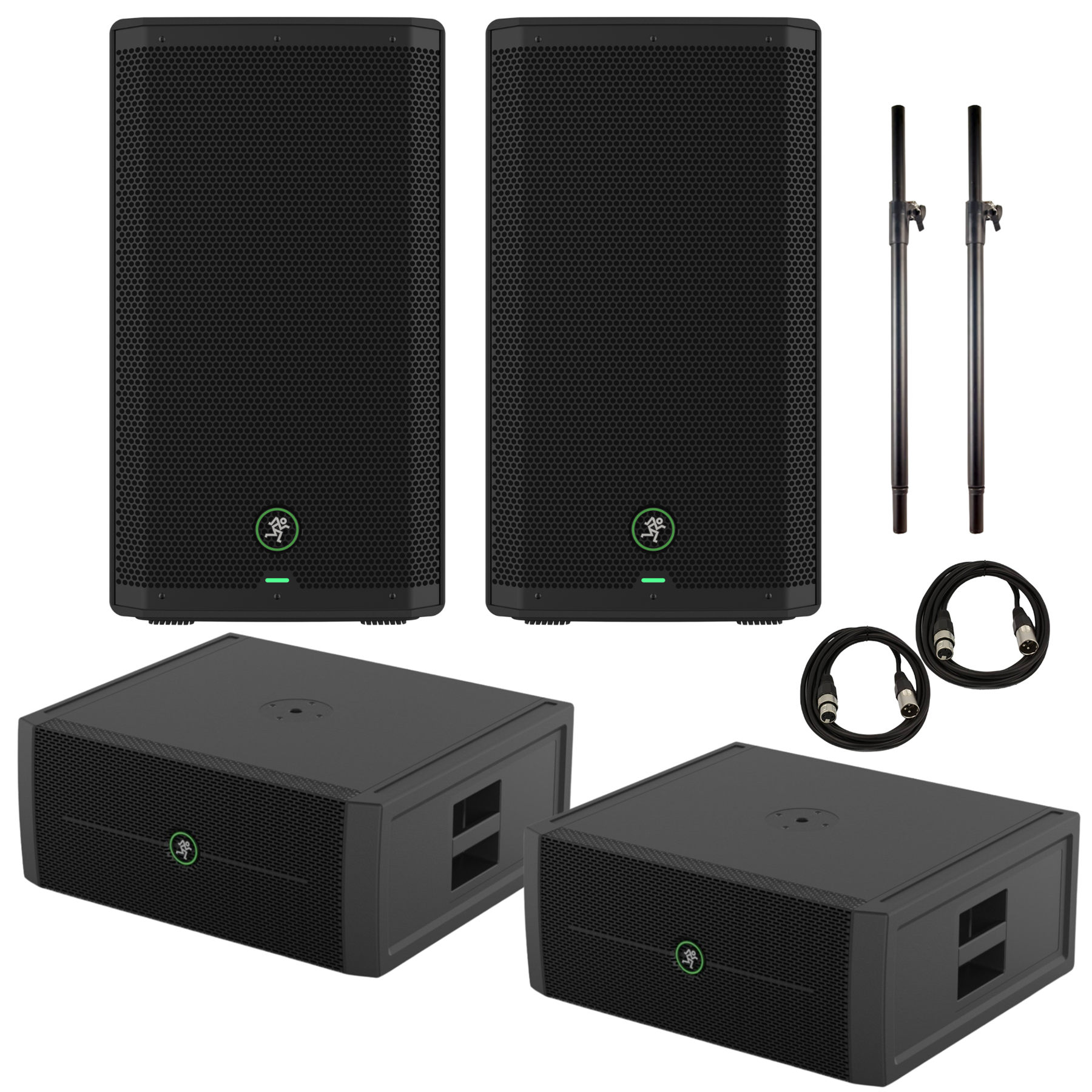 Bundle consists of 2x Mackie Thump Sub Go, 2x Mackie Thrash 212 Go, 2x XLR lead and 2x adjustable height speaker pole.