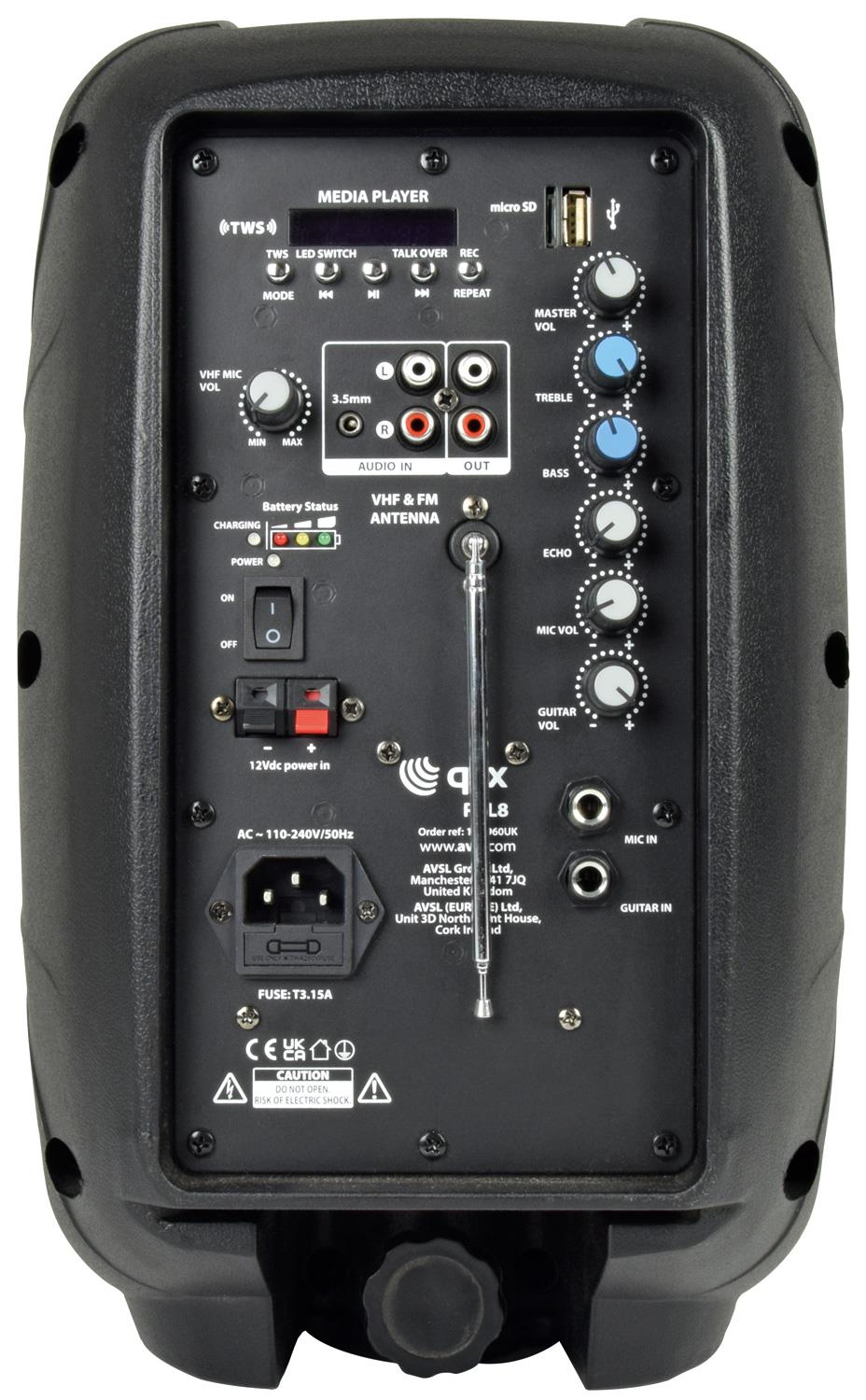 Compact portable PA unit with sturdy moulded cabinet and carrying handle. Powered directly from the mains supply, external 12Vdc or internal rechargeable battery for true portability. The main speaker cone is silvered to reflect a 7-colour LED show built into the front grille. A handheld VHF wireless microphone system is built into the rear panel and there are additional jack inputs for a wired microphone and guitar or other instrument. The integral USB/SD media player has an FM tuner and True Wireless Stereo receiver for wireless playback from a smart phone and linking with another PAL unit to form a wireless stereo pair. Overall, a complete sound and light system for house parties, singers and performers.