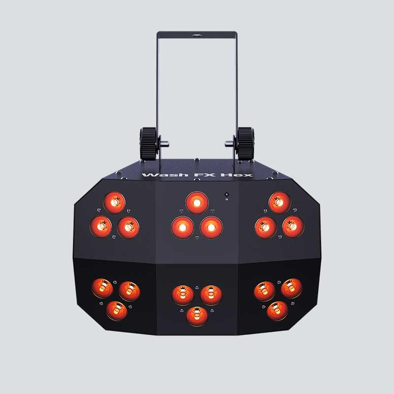 Brilliance, brightness and versatility are packed inside this powerhouse multi-purpose effect light that packs a punch with hex color (RGBAW+UV) LEDs. Wash FX Hex functions as a chase effect, blinder, or a wash light. 6 chasing zones mean Wash FX Hex can be used as a regular wash light or eye-candy effect and an advanced master/slave feature that allows you to mirror effects between units. Multiple control options include stand-alone mode, DMX, and IR as Wash FX Hex is compatible with an optional IRC-6 wireless remote for wireless triggering. Power linking saves time running cables. Fits best in the CHS-40 VIP gear bag.