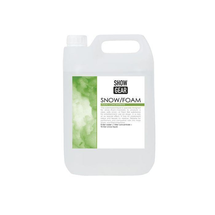 The Showgear Snow/Foam Concentrate 5 litre is a water based liquid, especially designed for snow and foam machines to produce a clear, safe snow or foam substance. It has no unpleasant odour and leaves no residue. The Snow/Foam Concentrate 5 litre is compatible with most snow and foam machines.