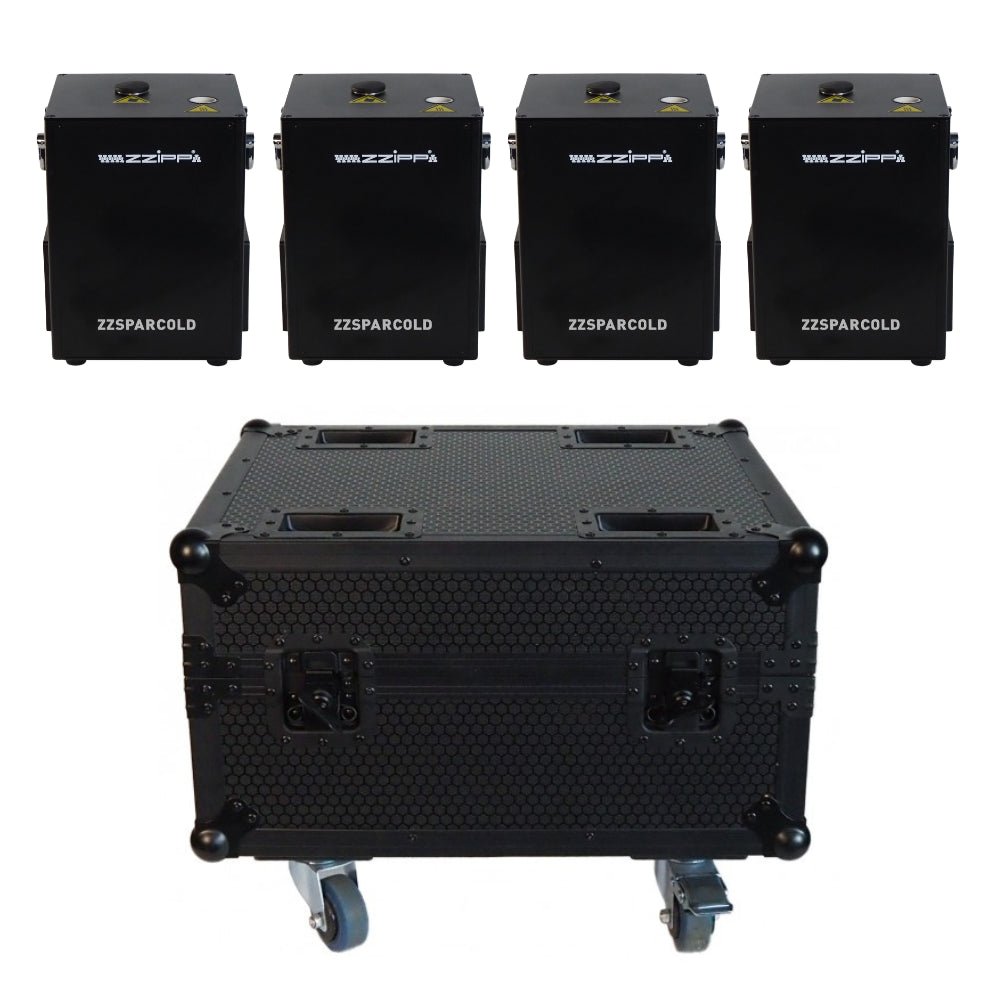 A bundle of 4 x ZZip Cold Spark Fountain Effect and flightcase