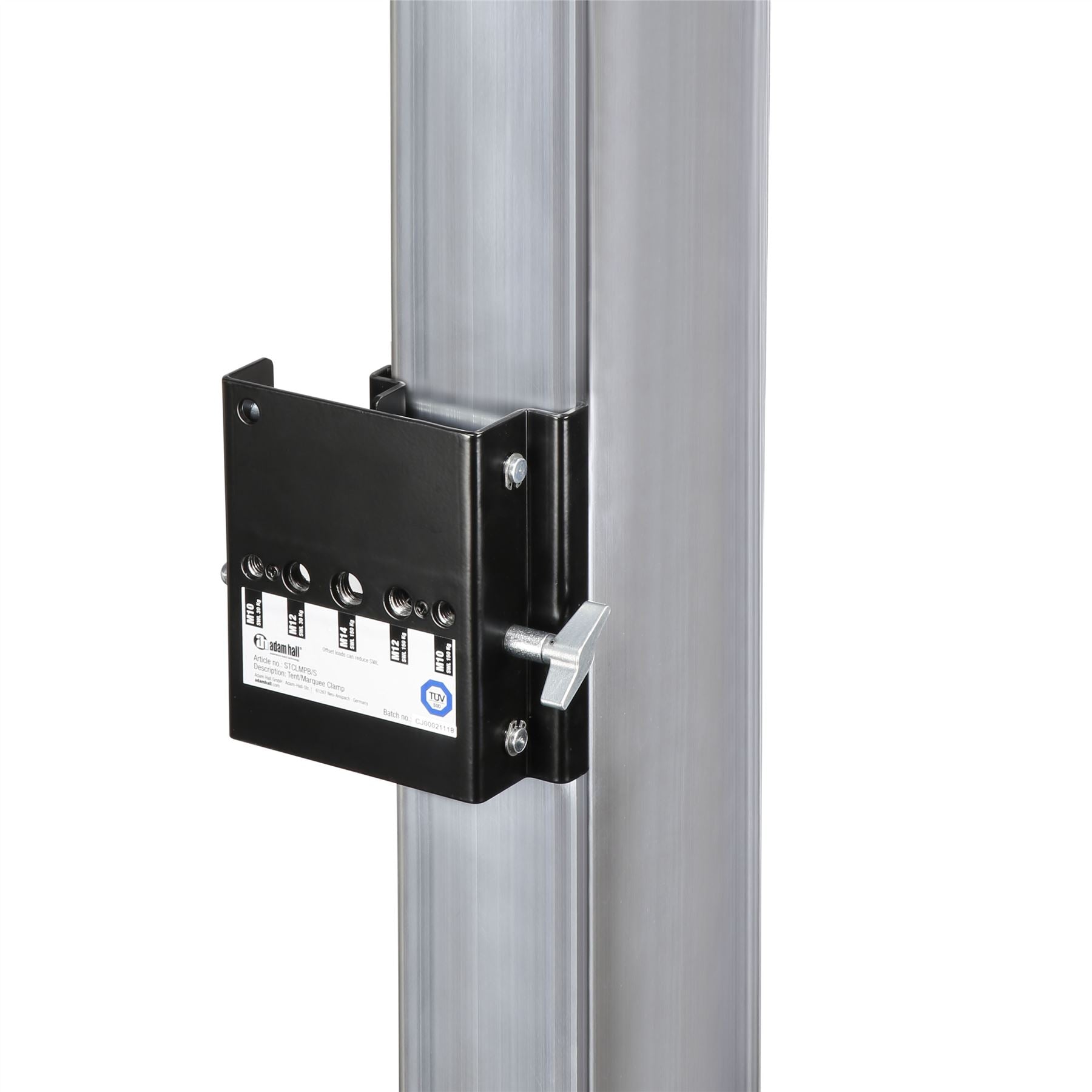 Easily create suspension points for audio and lighting equipment using this adjustable tent clamp. Designed specifically for clear span keder beam tents, it accomodates beam widths from 50 to 100 mm and supports weights of up to 150 kg. The clamp features five built-in attachment points for eye bolts and other rigging hardware.