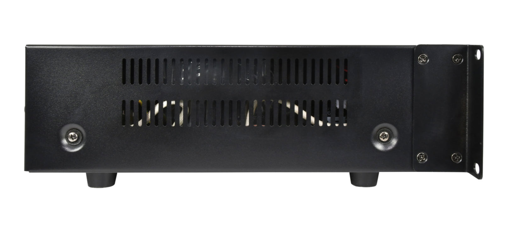 A-series mixer-amplifiers with switchable stereo or dual mono speaker outputs. Each speaker output has a stereo input source that can be selected between the internal audio player or three external stereo line inputs and even a digital optical input for AV applications. The inbuilt media player section offers playback of mp3 audio tracks from USB drive or microSD card and also has a B/T wireless receiver and FM radio tuner. Each speaker output zone has a wide ranging power capability from background music up to higher sound pressure levels, with Bass, Treble and Master Volume controls for independent sound management. Two microphone inputs have individual level controls and can be set to override the stereo line input for voice announcements. Emergency muting can be actuated from an alarm panel via the 24V EMG MUTE contacts on the rear panel. The A-series commercial amplifiers offer sophisticated functionality and power in a convenient 2U rack package with a comprehensive and accessible control surface. Each variant of this range is appointed to meet the needs of different sized installations with flexible setup options to serve various system topologies.