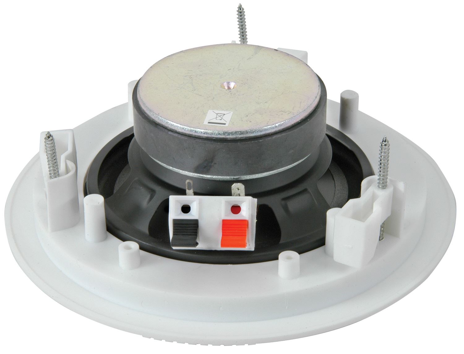 A wide range speaker with a 13cm (5.25") polypropylene cone with foam rubber surround to minimise distortion. The housing is made from white ABS with a rigid steel grille also in white to mount discreetly into a ceiling.