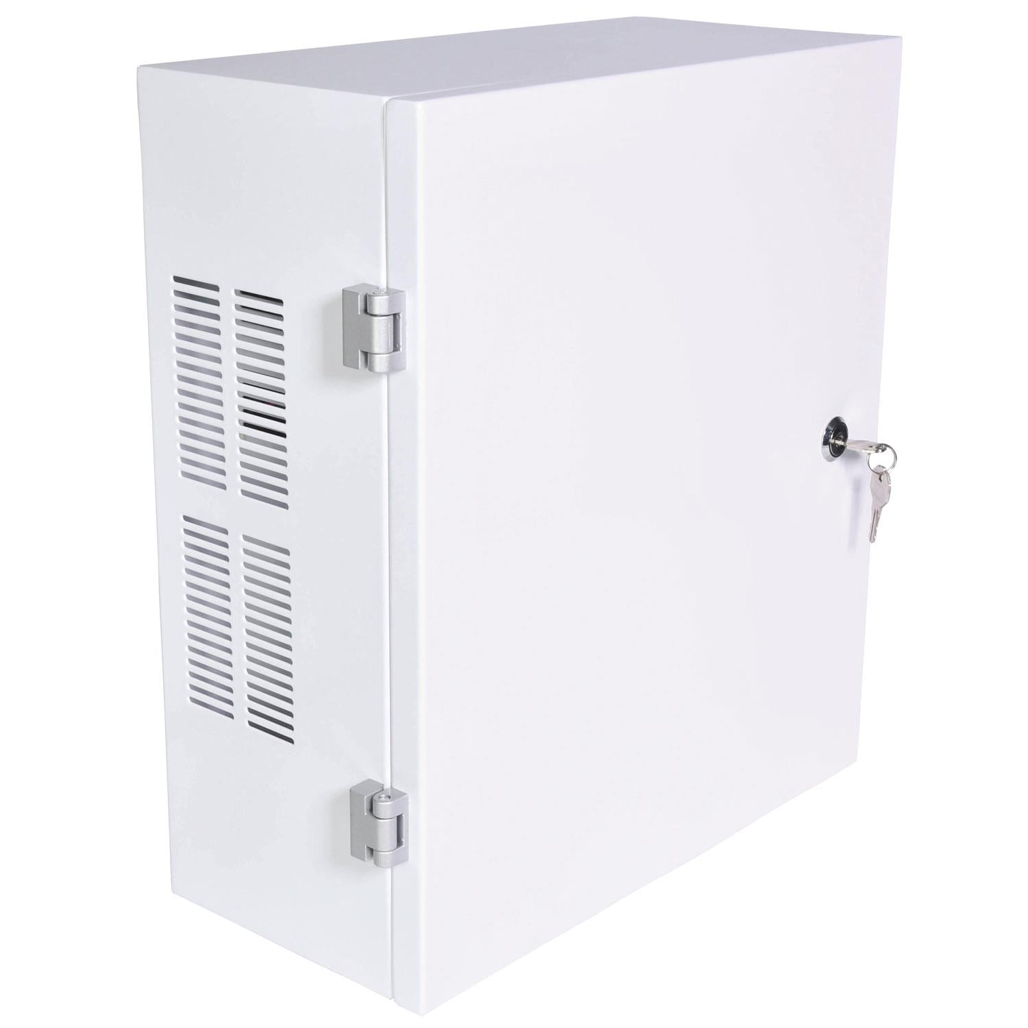 Public address mixer-amplifier built into a surface-mount secure box. A powerful 240W output can drive either 100V line or low impedance speakers from binding post terminals inside the cabinet. The system includes a handheld UHF microphone with an inbuilt receiver, and two switchable wired mic/line inputs are provided on combo XLR/jack sockets. Each mic input has switchable +48V phantom power and priority override, which mutes the Aux inputs during voice operation. An internal media player enables playback of audio tracks from USB/SD player, DAB+/FM tuner, or Bluetooth pairing. Alternatively, line inputs can be connected to the Aux 1 RCA sockets or separate Aux 2 RCA/3.5mm jack sockets. For emergency control, there are 24V terminals on the bottom for patching into an alarm panel to mute all except the Mic 1 input. The combination of flexible input section and a high-efficiency amplifier in a strong, lockable cabinet provides a complete solution for buildings where security and ease of use is essential.